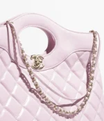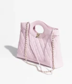 This Chanel 31 shopping bag is made of light pink lambskin with gold-tone hardware, cut-out top handles, magnetic snap closure, CC logo printed on the front and shoulder strap made of light pink leather and gold-tone chain links. The interior is lined with a light pink grosgrain and leather mix and has an open pocket on the back wall.