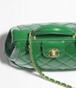 This Chanel top handle flap bag is crafted from green shiny lambskin with light gold hardware, the trapezoidal design features signature diamond quilting, and features the signature CC interlocking clasp, top handles, and a long light gold and green leather chain.