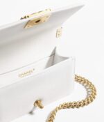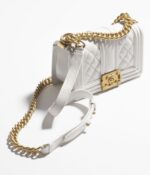 This Chanel Small Boy Bag is in white lambskin with gold-tone hardware, tone-on-tone stitching, front flap with Le Vintage Boy CC push closure, smooth leather trim, antique gold-tone chain link and white leather shoulder strap.