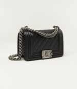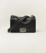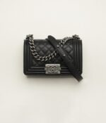 This Chanel Small Boy bag is crafted from black lambskin leather with ruthenium hardware, tone-on-tone stitching, front flap with Le Boy CC snaps, smooth leather trim, ruthenium chain and black leather shoulder strap.