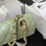 This small Classic Double Flap Bag in Light Green Caviar Leather with Light Gold Hardware features the signature CC turnlock closure on the front flap, half-moon back pocket, adjustable interwoven Light Gold Chain and Light Green Leather Shoulder Strap.