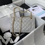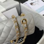 This Small Classic Double Flap bag is in grey caviar leather with light gold tone hardware and features a front flap with signature CC turnlock closure, half moon back pocket, and adjustable interwoven light gold tone chain link and grey leather shoulder strap.