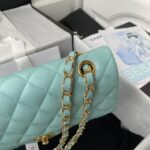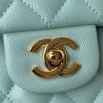 This small Classic Double Flap Bag is crafted in light blue caviar leather and features light gold hardware, front flap with signature CC turnlock closure, half-moon back pocket, adjustable interwoven light gold chain and light blue leather shoulder strap.