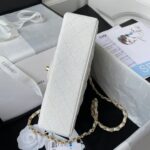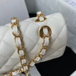 This Small Classic Double Flap bag is in white caviar leather with light gold tone hardware and features a front flap with signature CC turnlock closure, half moon back pocket, and adjustable interwoven light gold tone chain link and white leather shoulder strap.