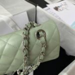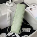 This small version of the classic double flap bag is crafted in light green caviar leather with silver hardware, front flap with signature CC turnlock closure, half-moon back pocket, adjustable interwoven silver chain and light green leather shoulder strap.