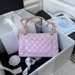 This small Classic Double Flap Bag is crafted in light purple lambskin with gold hardware, front flap with signature CC turnlock closure, half-moon back pocket, adjustable gold interwoven chain link and light purple leather shoulder strap.