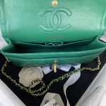 This Small Classic Double Flap bag is in Green lambskin leather with light gold tone hardware and features a front flap with signature CC turnlock closure, half moon back pocket, and adjustable interwoven light gold tone chain link and green leather shoulder strap.