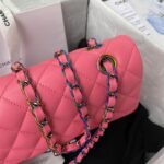 This Chanel Classic Small Flap Bag in dark pink lambskin with gradient metal hardware features a front flap with CC turnlock closure, half-moon back pocket, adjustable interwoven gradient chain and dark pink leather shoulder/crossbody strap.