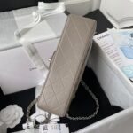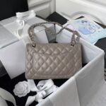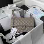 This small Classic Double Flap Bag is crafted in dark grey lambskin with silver hardware, front flap with signature CC turnlock closure, half-moon back pocket, adjustable interwoven silver chain and dark grey leather shoulder strap.
