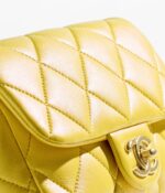 This Chanel Square Double Bead Flap Bag in yellow lambskin with brushed gold hardware features front flap with signature CC turnlock closure, tonal stitching, single interwoven yellow leather and brushed gold chain link pearl shoulder/crossbody strap.