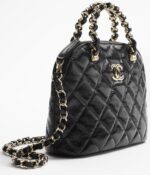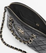 This Chanel chain crossbody bag is crafted from shiny black lambskin leather with light gold hardware, signature diamond quilting, light gold CC logo printed on the front, zip closure, half-moon back pockets, and interwoven black leather and light gold chain shoulder/crossbody strap.
