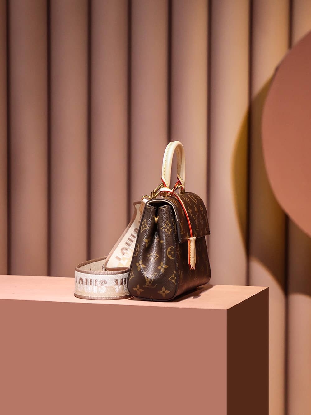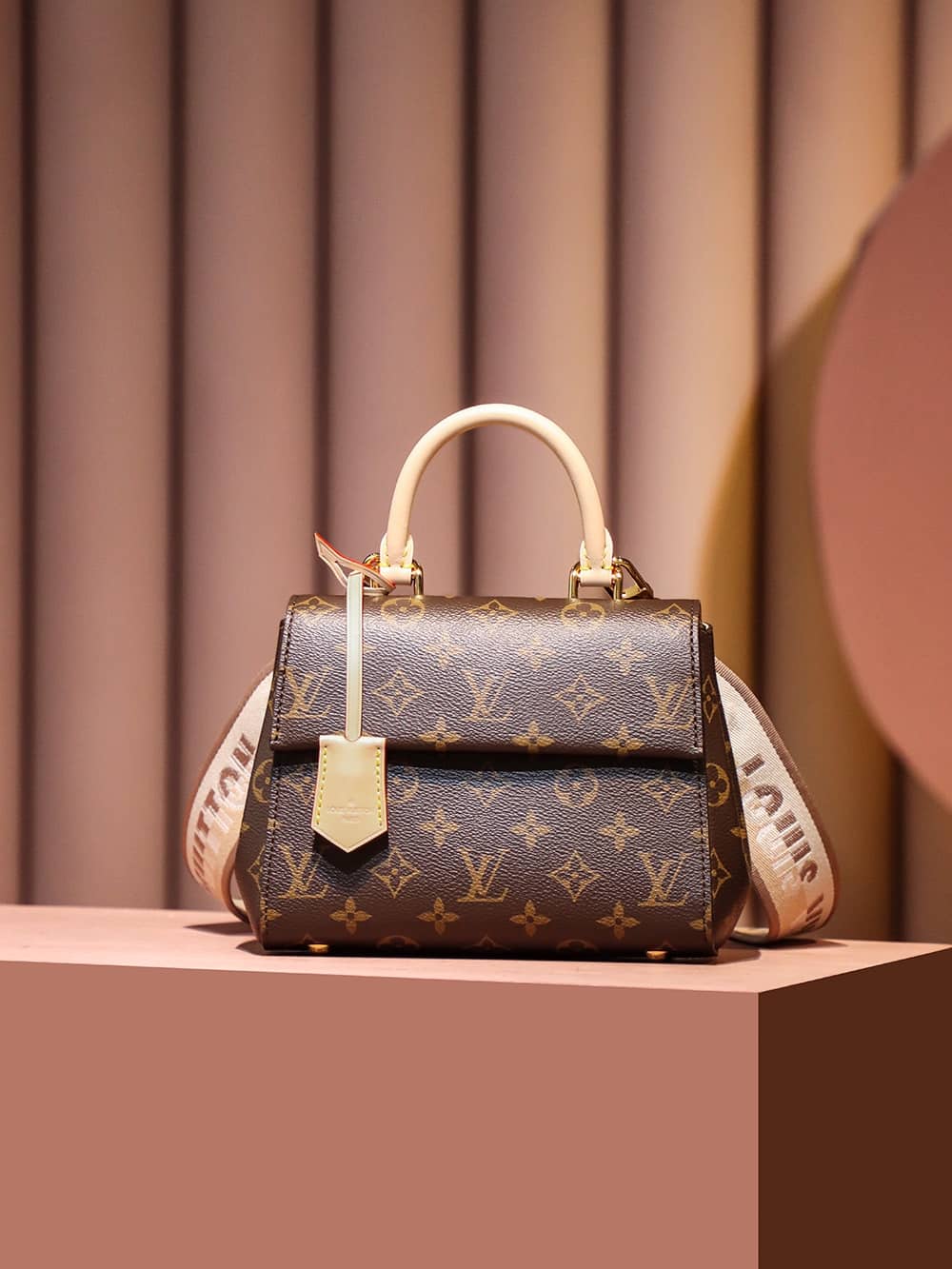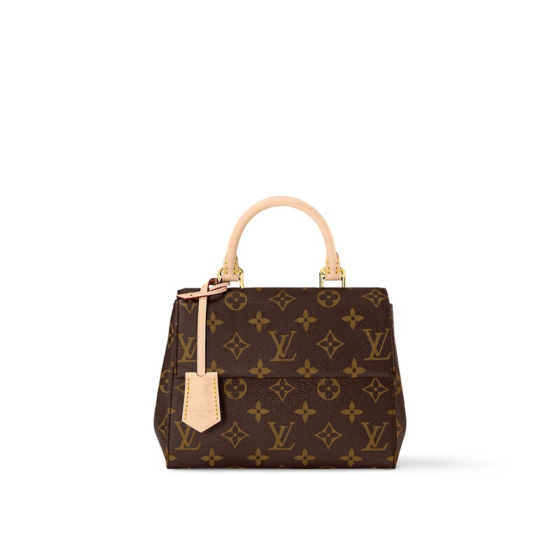 The adorable Cluny Mini handbag in iconic Monogram canvas is designed to delight LV lovers. A perfect little bag for daily wear, it features a signature Toron handle and key bell in the Maison’s classic natural leather. A textile strap enriched with a woven “Louis Vuitton” can be added or detached, thus enhancing the bag’s versatility.