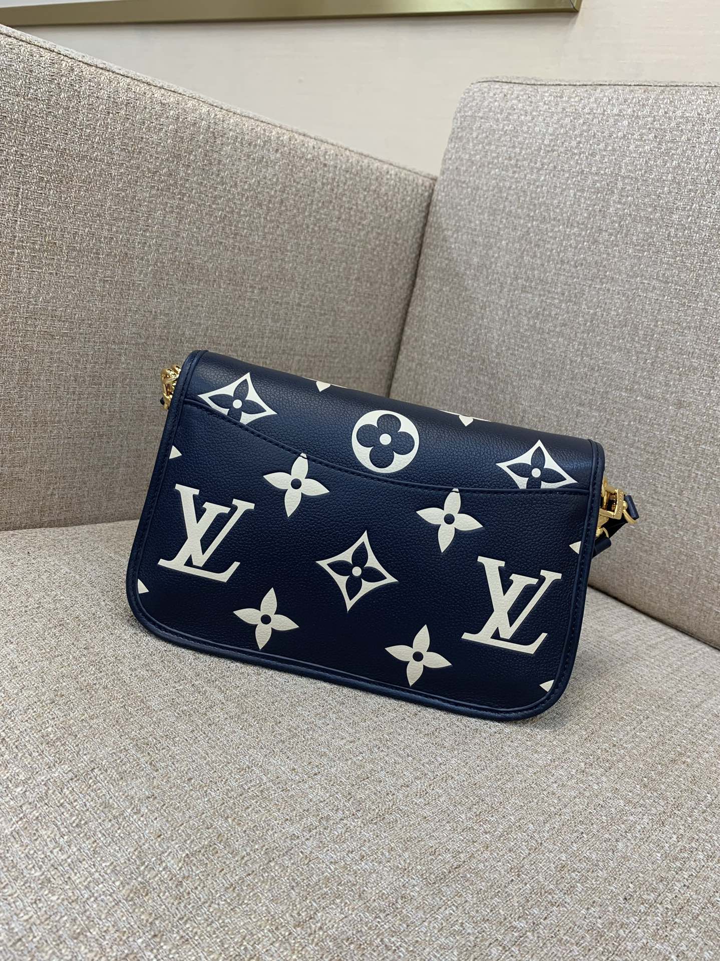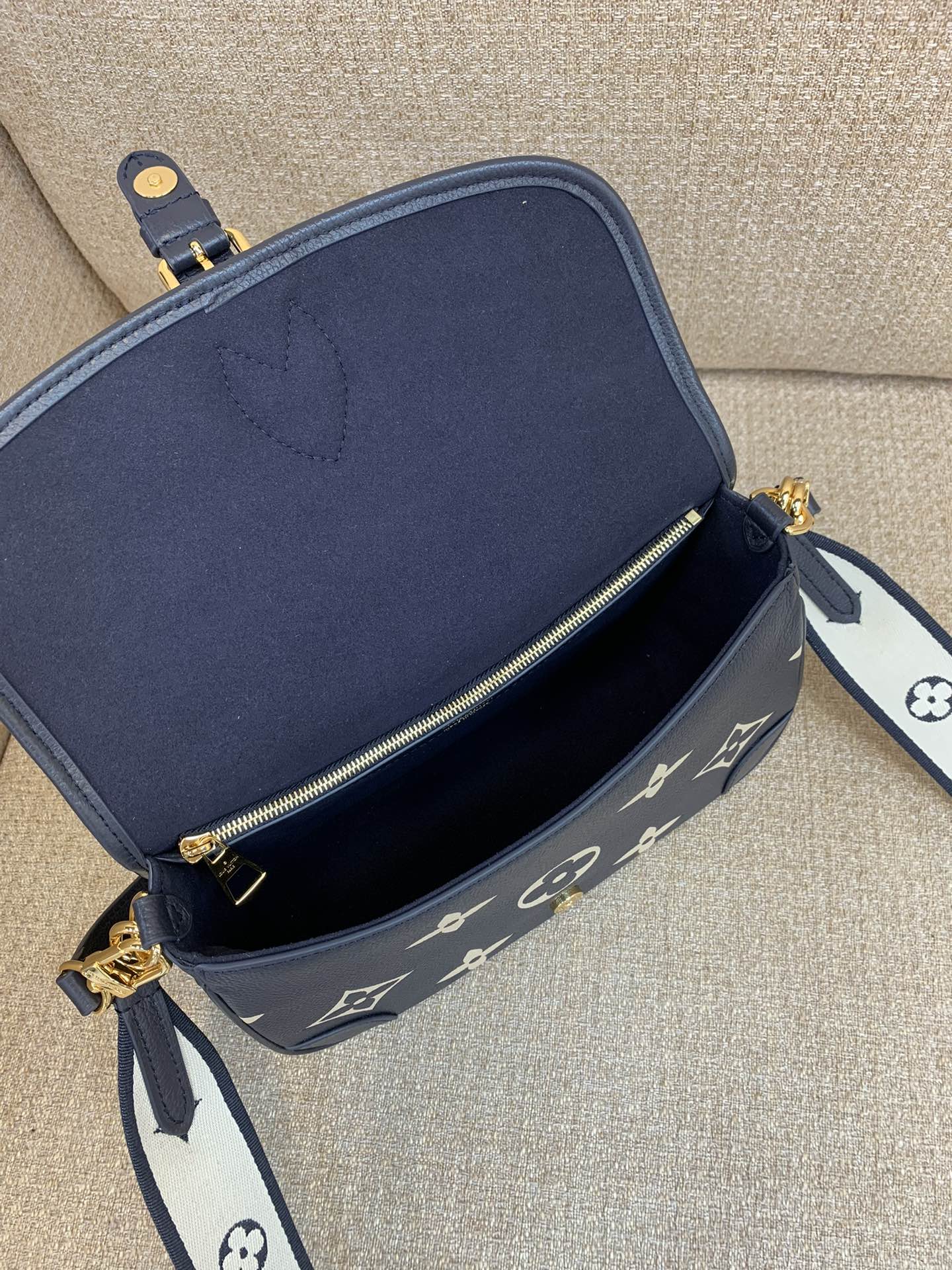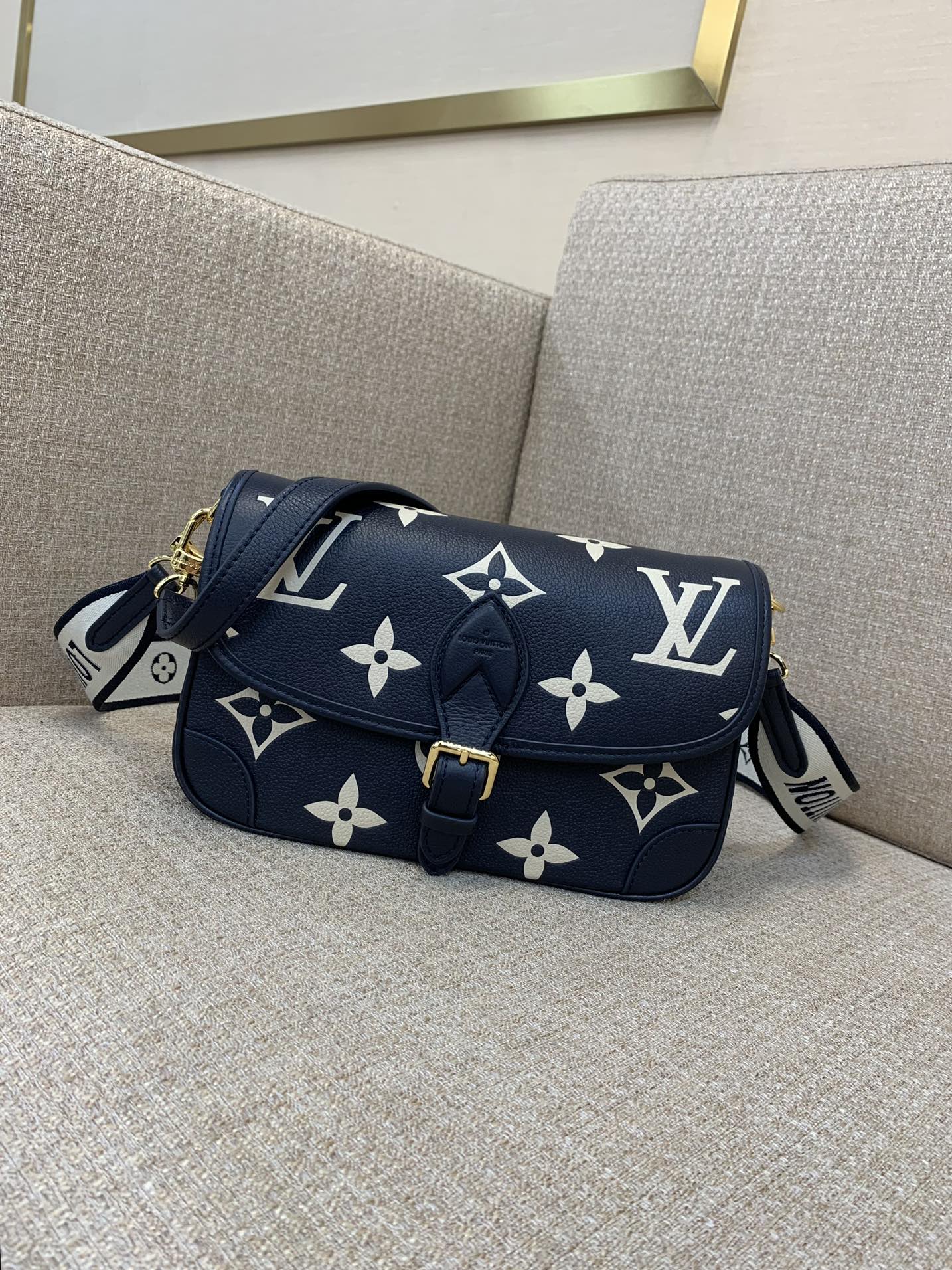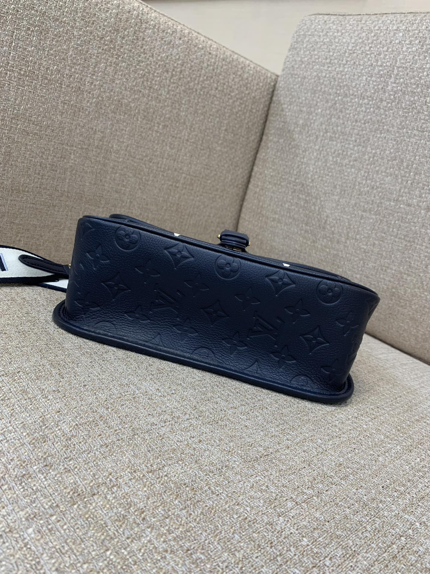 Part of the Nautical Collection, this Diane PM satchel bag is made from two-tone Monogram Empreinte leather and features a distinctive gold-color buckle. It has both a removable jacquard cross-body strap with “Louis Vuitton” woven into it, and a second shorter detachable strap for hand and short-shoulder carry.