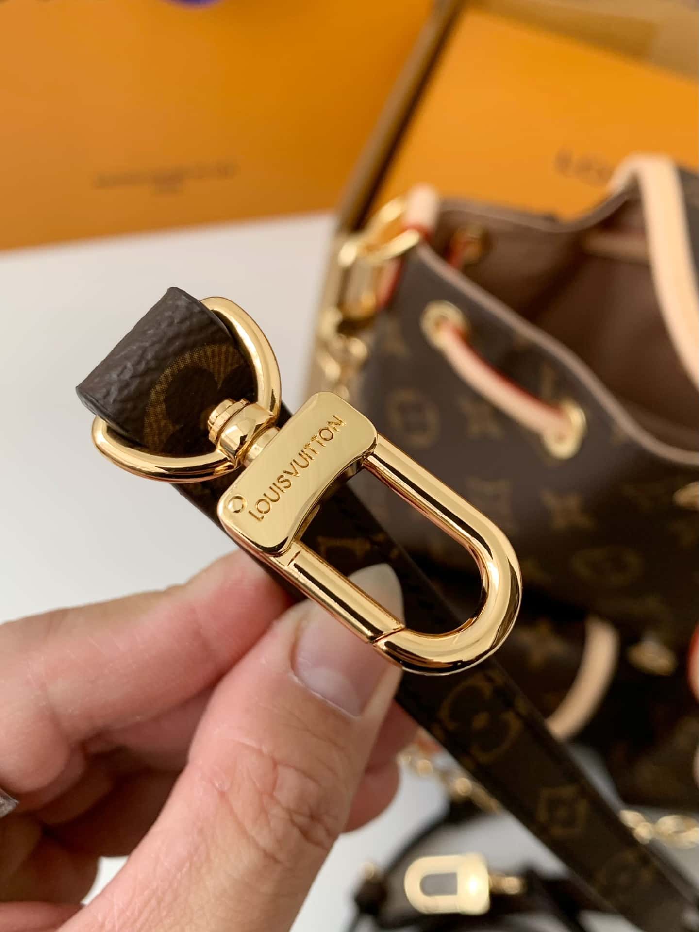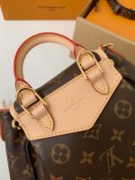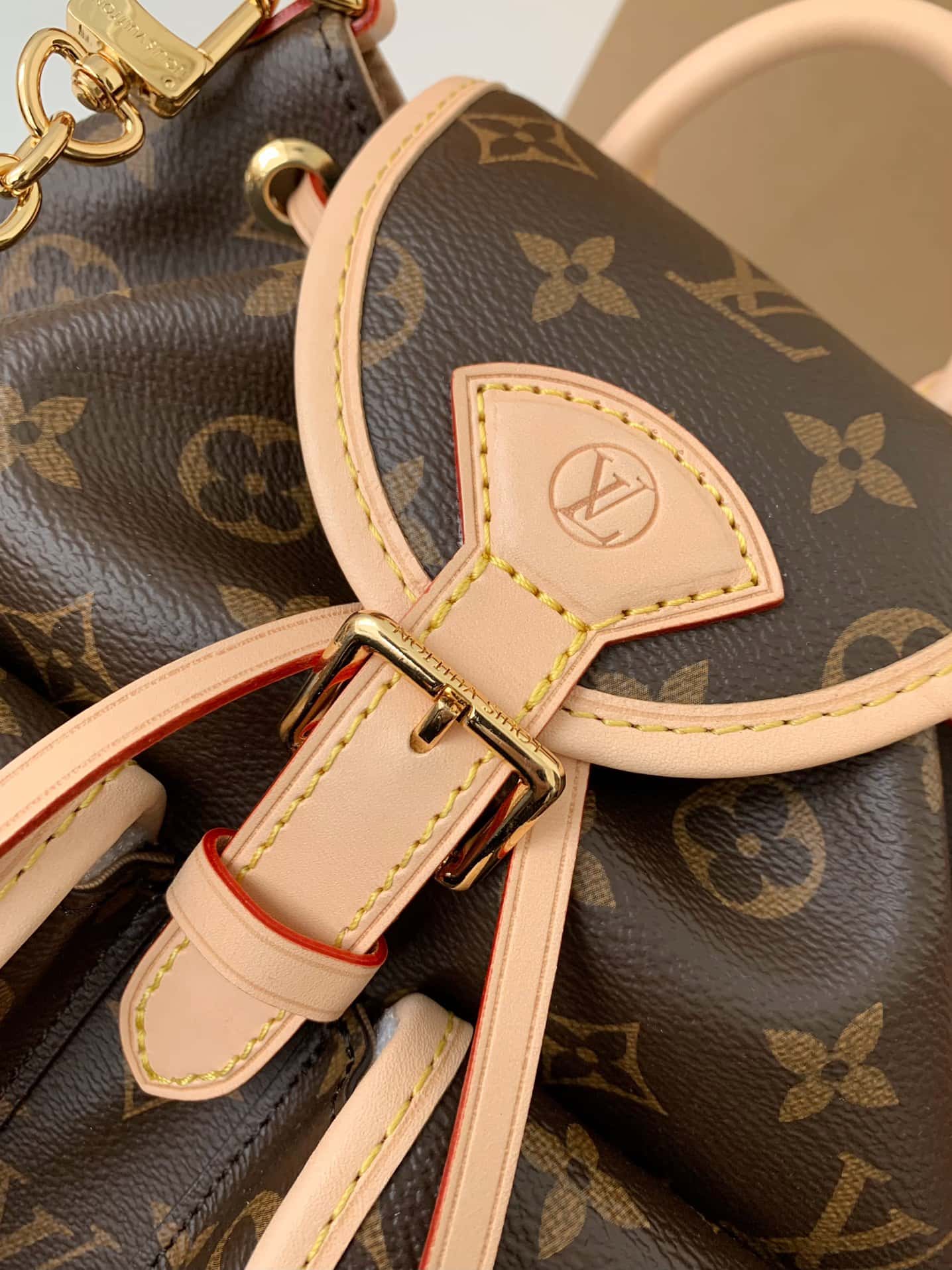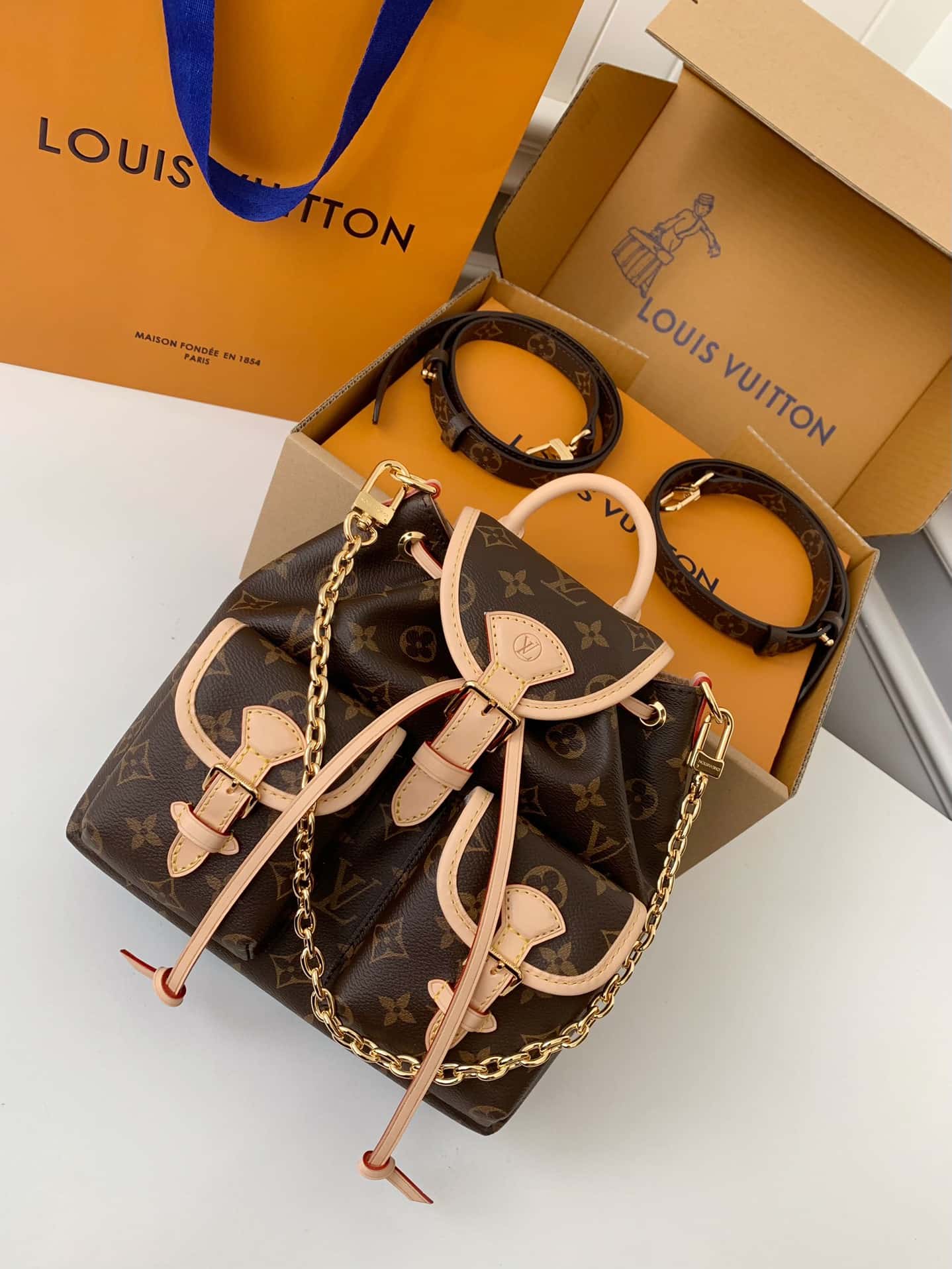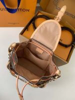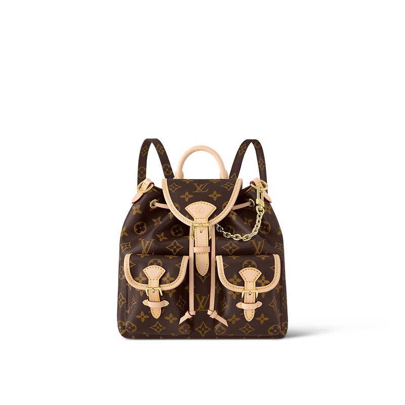 Made from Monogram canvas with leather trim, the super-cute, super-functional Excursion PM backpack has a design clearly influenced by the world of hiking. The main compartment closes with an adjustable sliding buckle and there are two pockets with buckles on the front. A gold-color chain, in addition to the top handle, enable different carries.