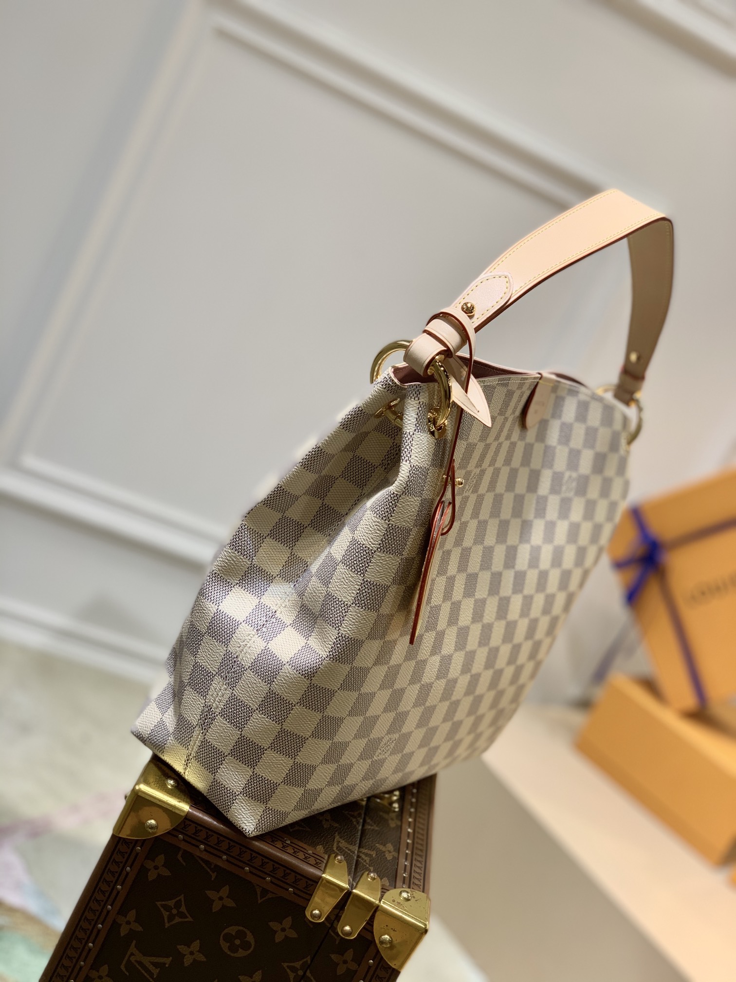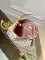The Graceful PM hobo in fresh Damier Azur canvas is a lightweight, roomy bag to carry every day. Natural cowhide leather detailing and golden hardware add a refined touch. The body-friendly design combines with a supple, flat handle for stylish and comfortable over-the-shoulder wear. The magnetic closure and zipped inside pocket keep belongings secure.