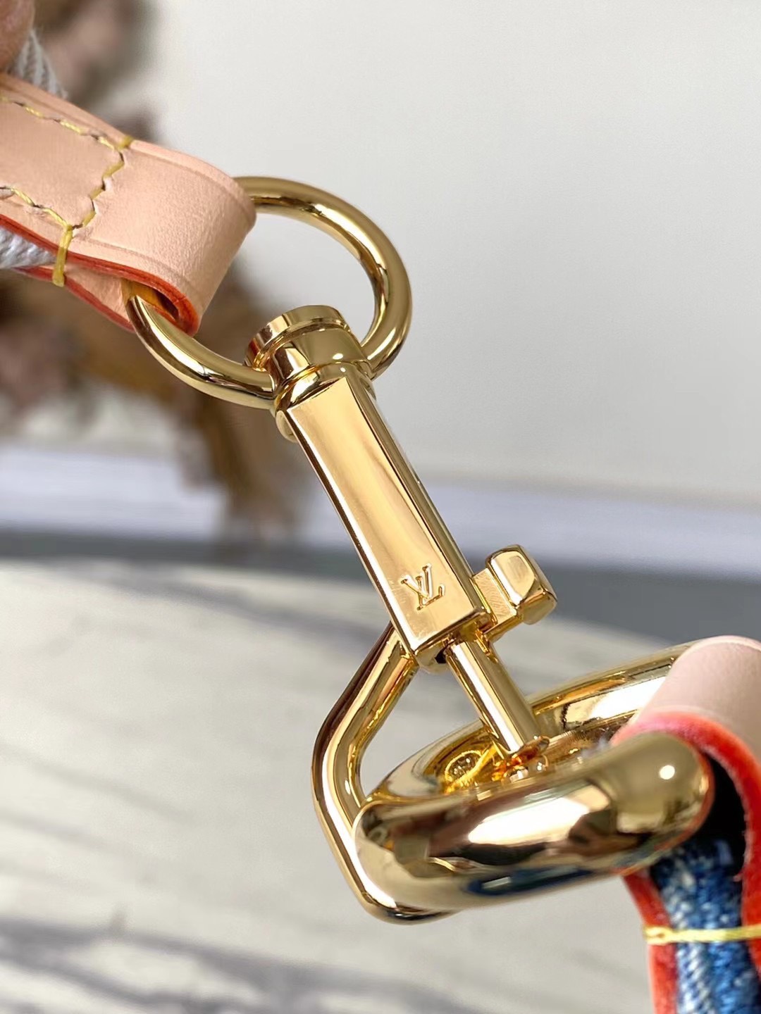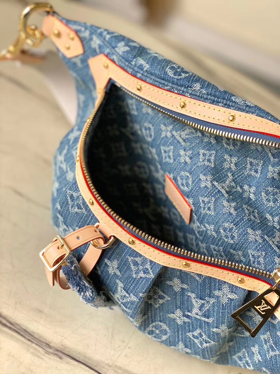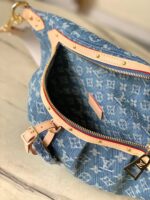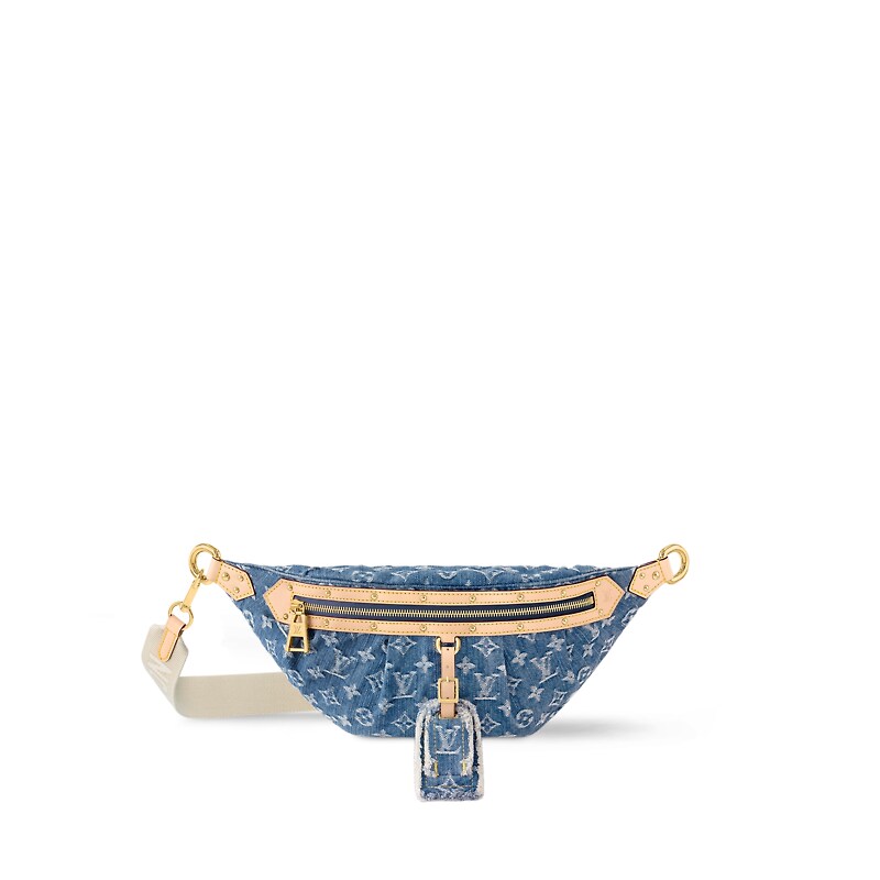 Made from Monogram Denim, the High Rise bumbag is trimmed with natural leather. Notably around the zipper, where the cowhide is adorned with golden studs. A removable name tag, also in distressed Monogram Denim, adds a distinctive touch. The removable and adjustable textile strap gives carry options.