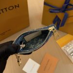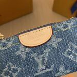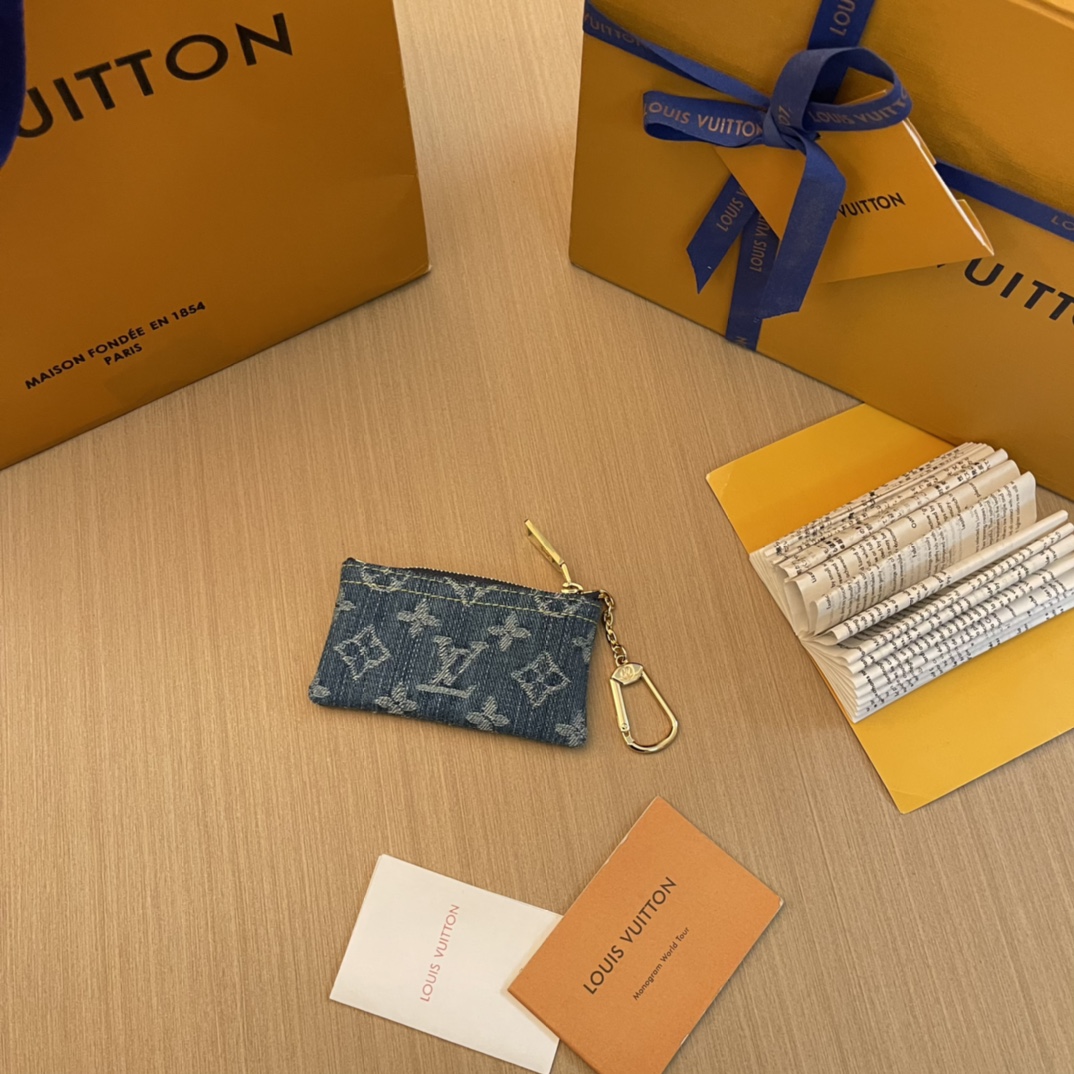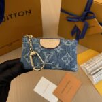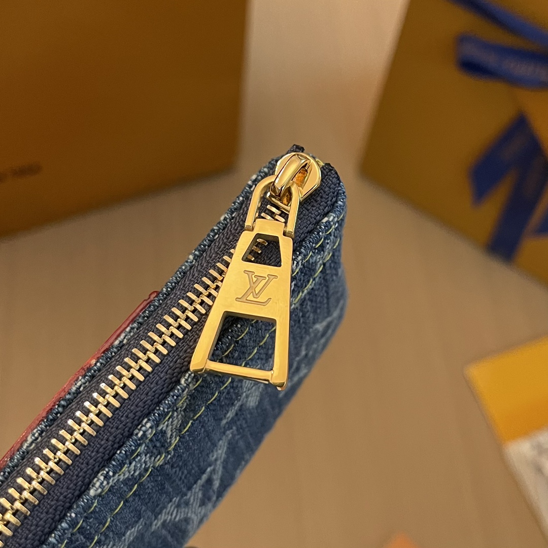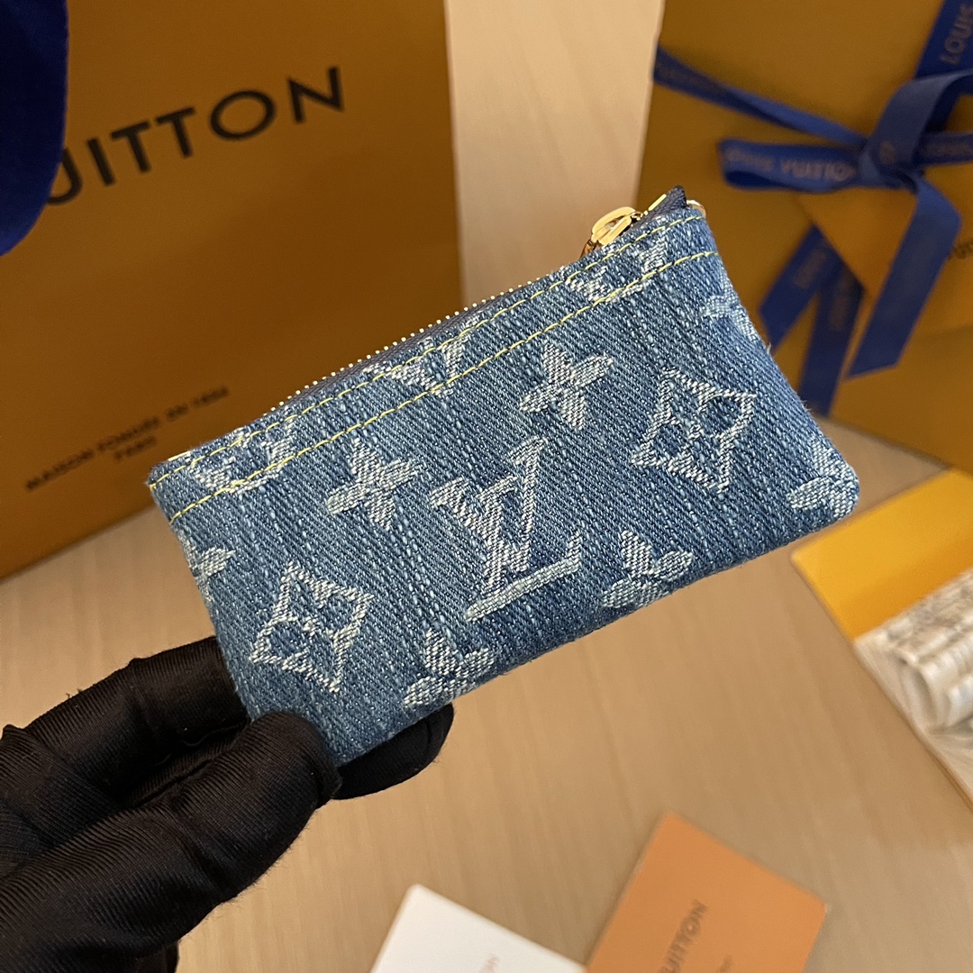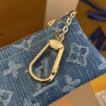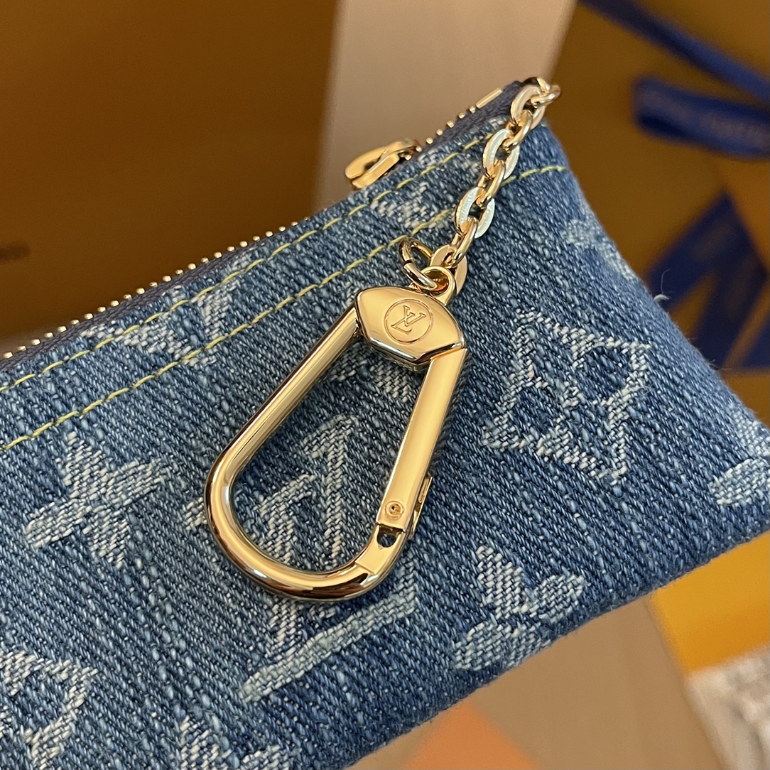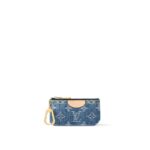 The Key Pouch is made from stone-washed Monogram Denim, with natural cowhide-leather trim and gold-color hardware. In addition to holding keys, it can also be used to securely carry cash and cards thanks to its zip closure. A small hook-and-chain allows it to be attached to a bag or belt.