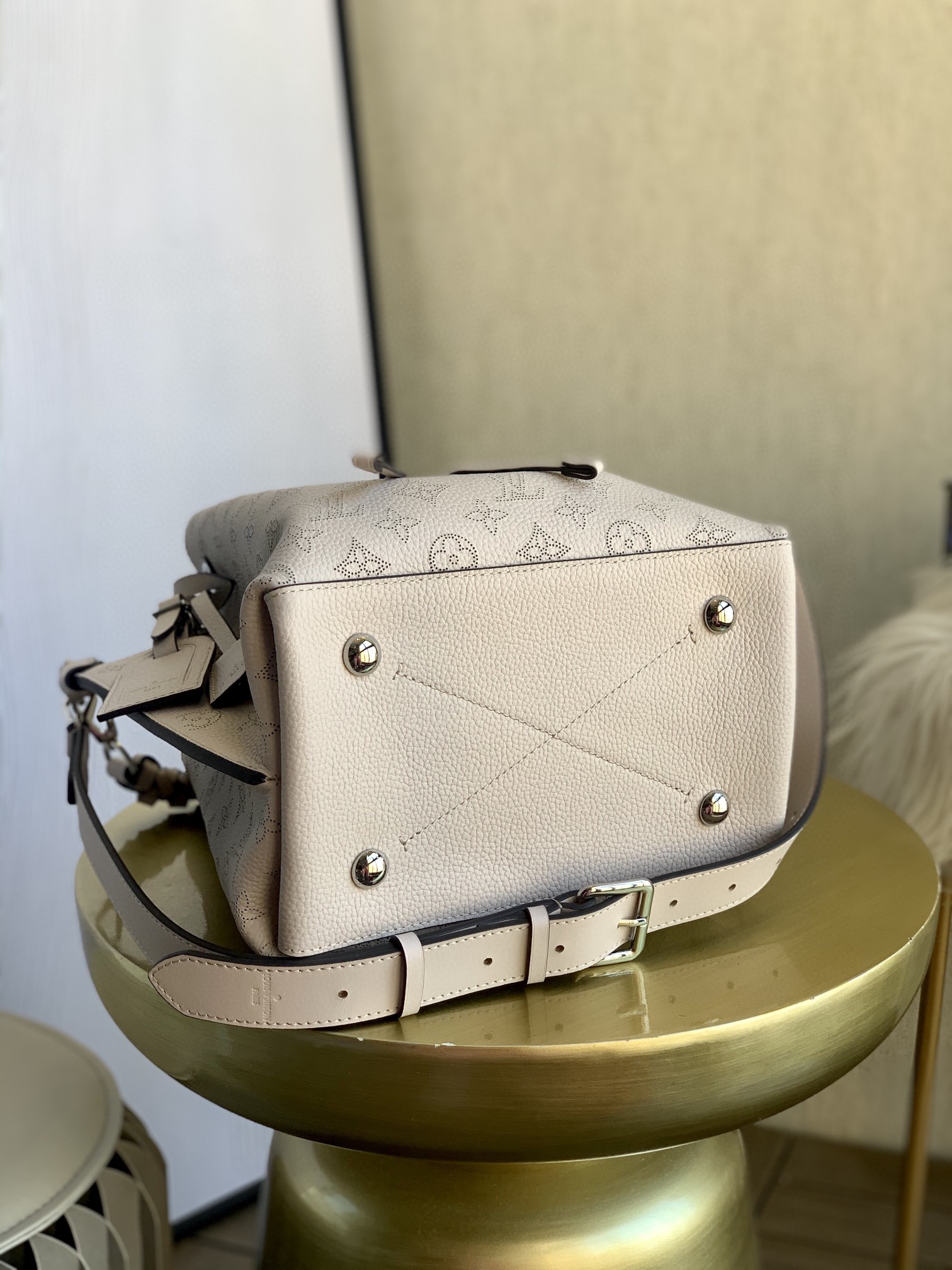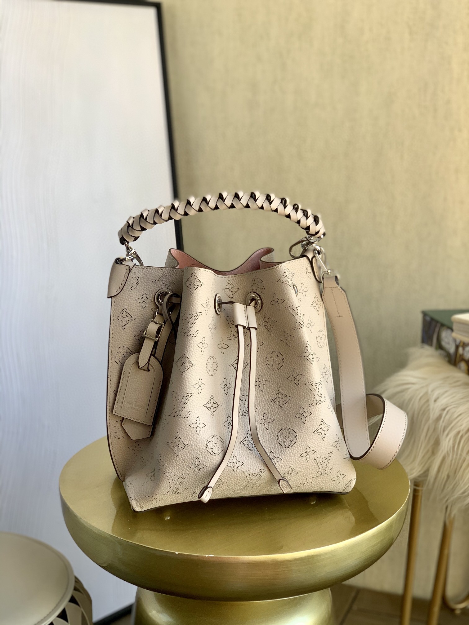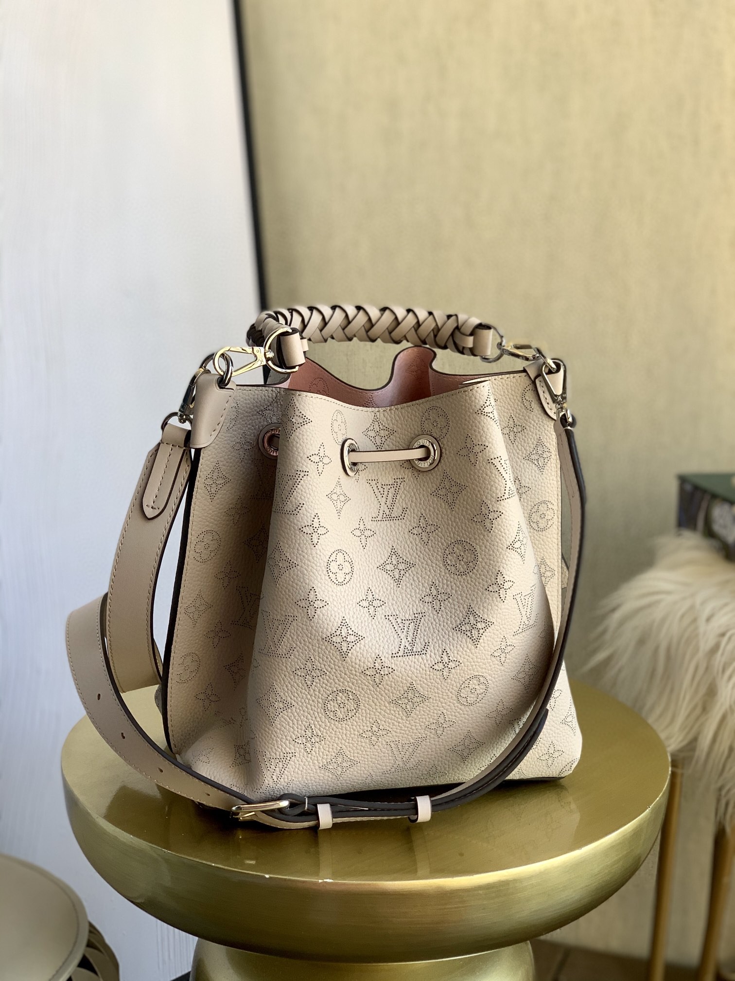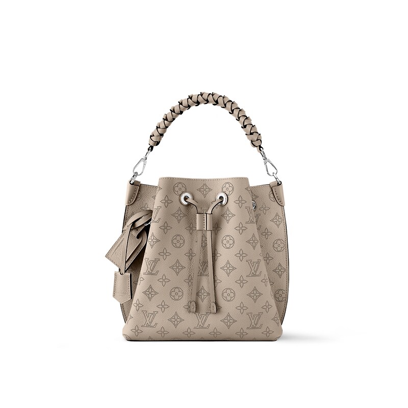 The Muria bucket bag is made from Mahina calf, a perforated leather with a discreet Monogram motif. Supple and sophisticated, it is a pleasure to carry, either by the braided top handle or the long leather strap, which adjusts for short- and long-shoulder or hands-free cross-body wear. Crafted signature details include a name tag and keybell in smooth calfskin.