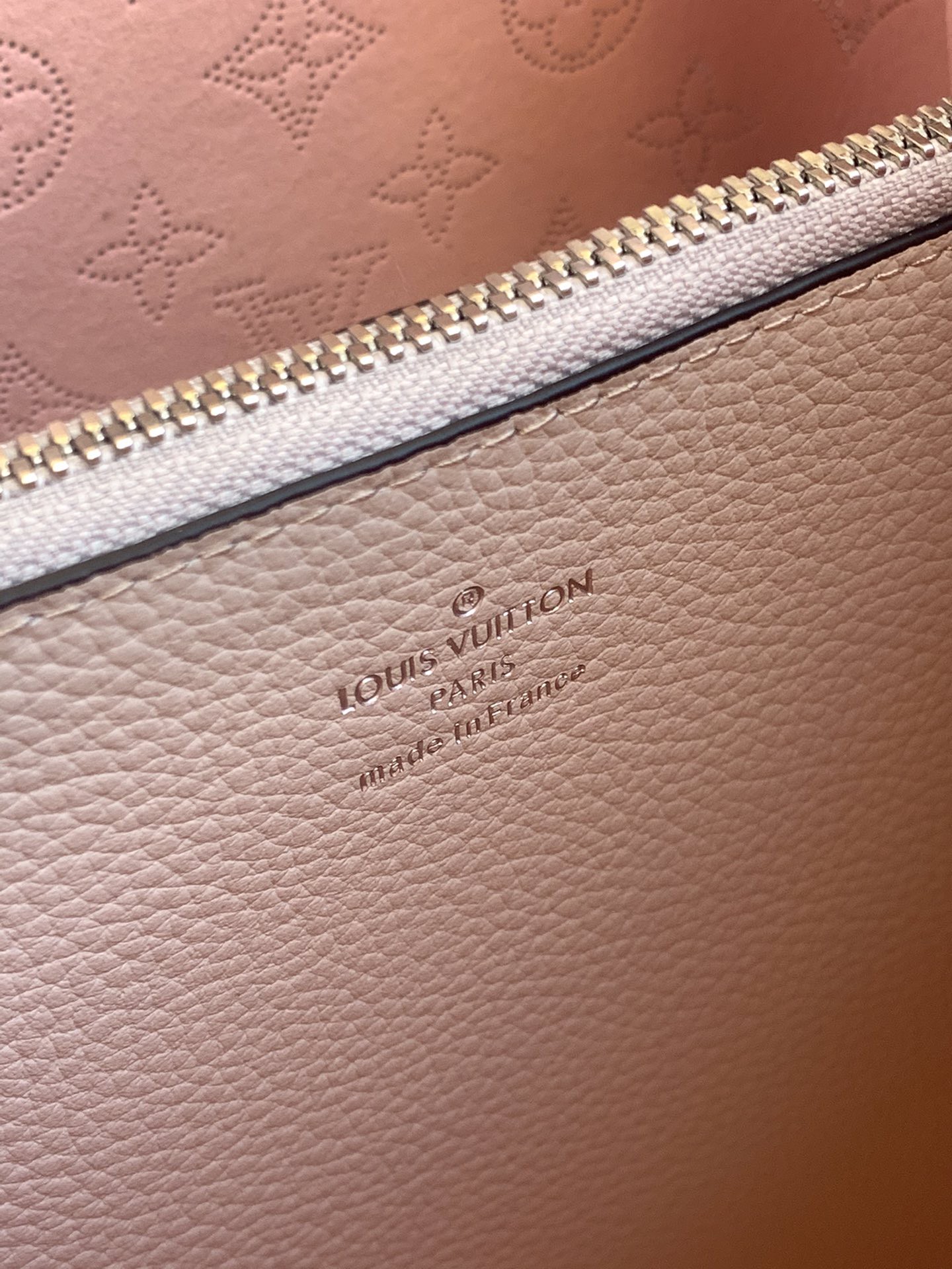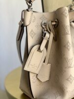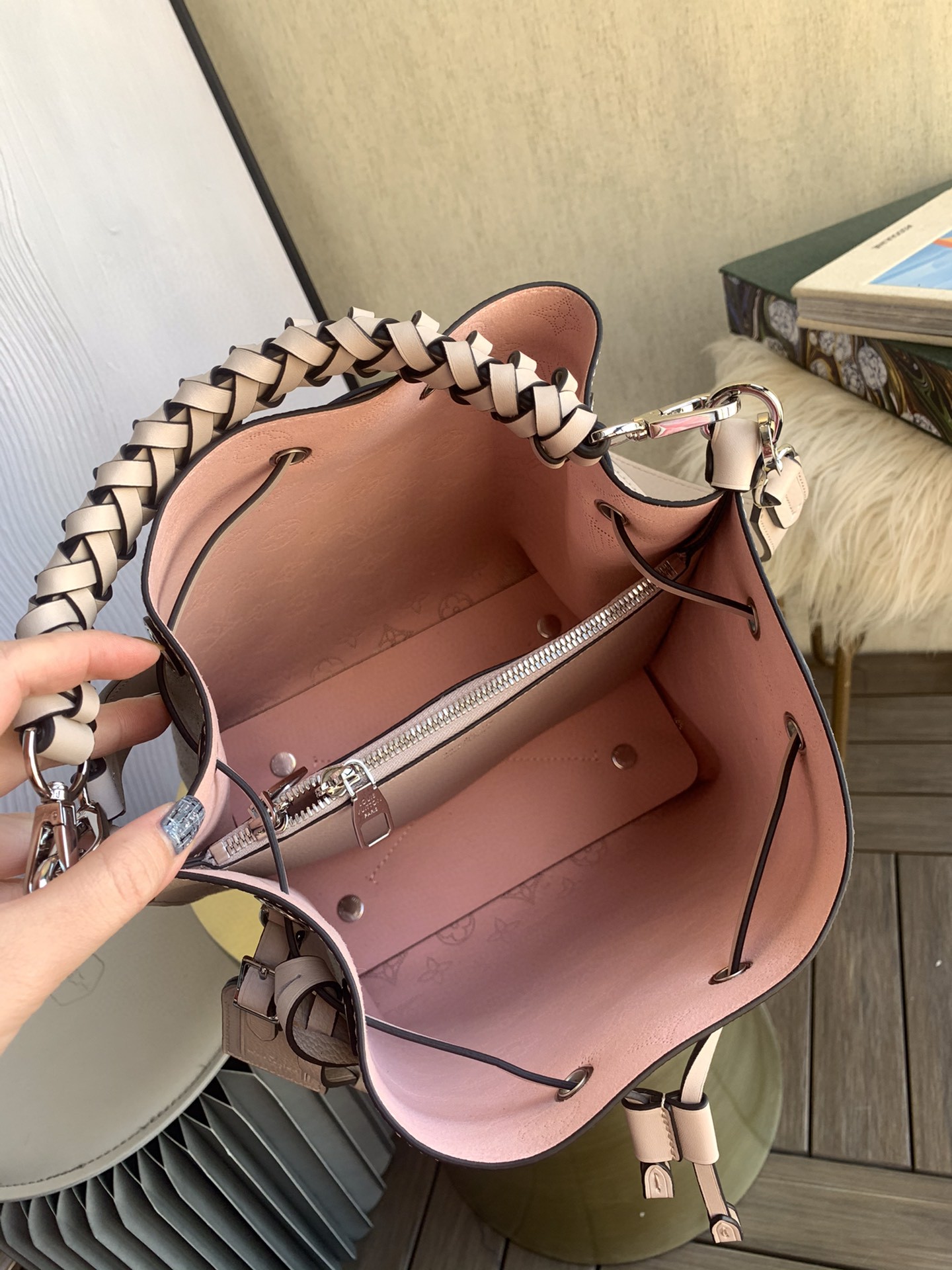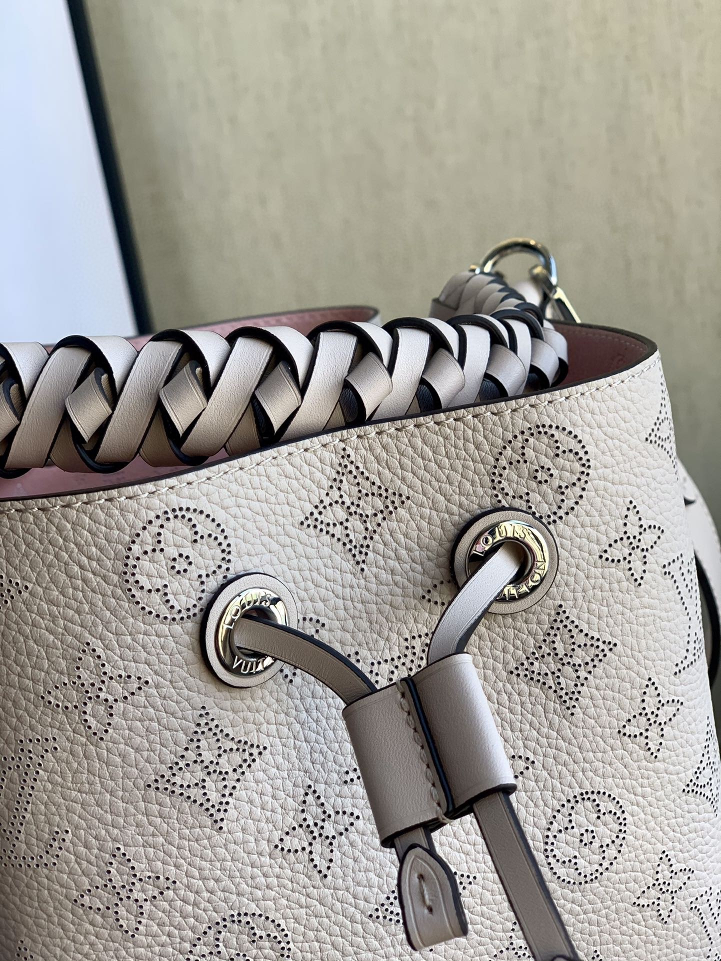 The Muria bucket bag is made from Mahina calf, a perforated leather with a discreet Monogram motif. Supple and sophisticated, it is a pleasure to carry, either by the braided top handle or the long leather strap, which adjusts for short- and long-shoulder or hands-free cross-body wear. Crafted signature details include a name tag and keybell in smooth calfskin.