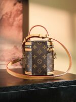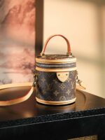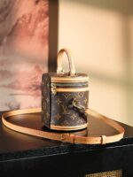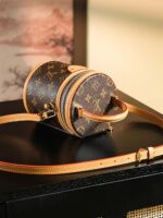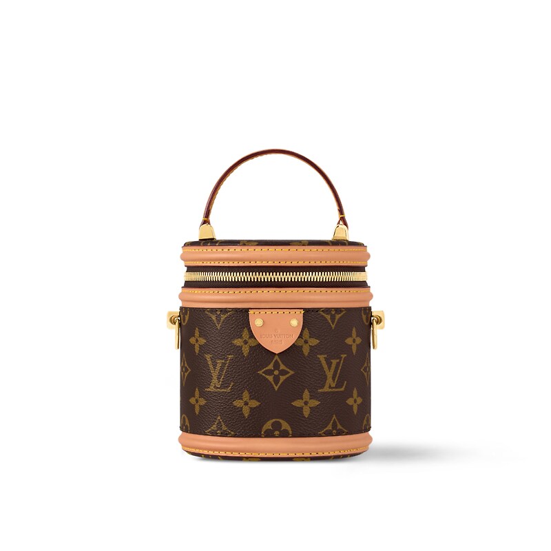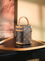 The Nano Cannes bag in Monogram canvas is notable for its cylindrical shape, which was inspired by a beauty case. This meticulously crafted piece is complemented by natural leather trim, including a tag embossed with the Louis Vuitton signature. Its top handle and adjustable, removable shoulder strap offer different carry options.