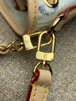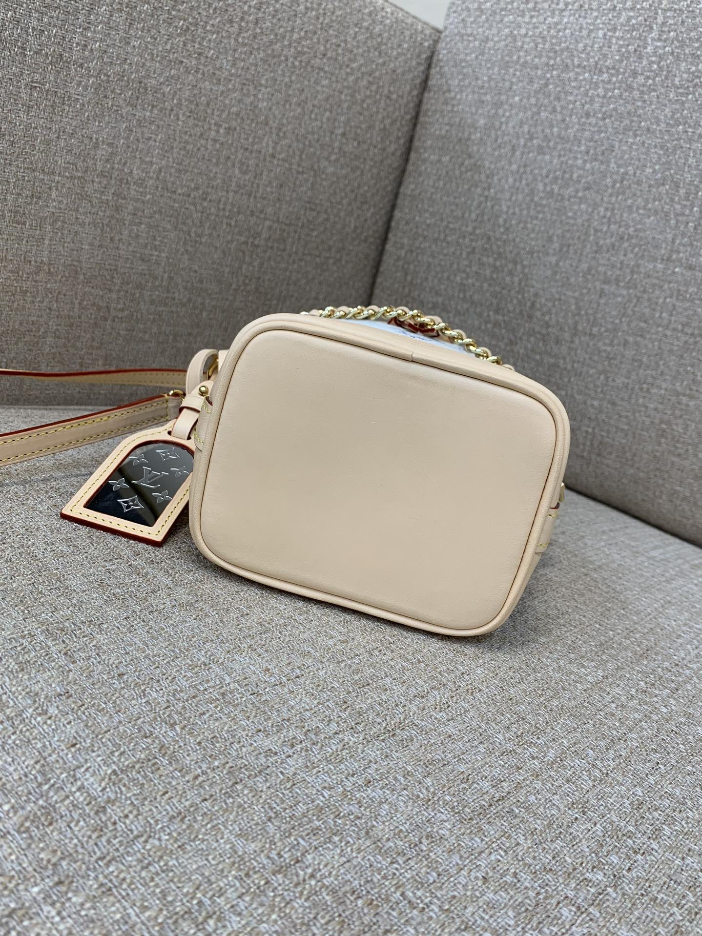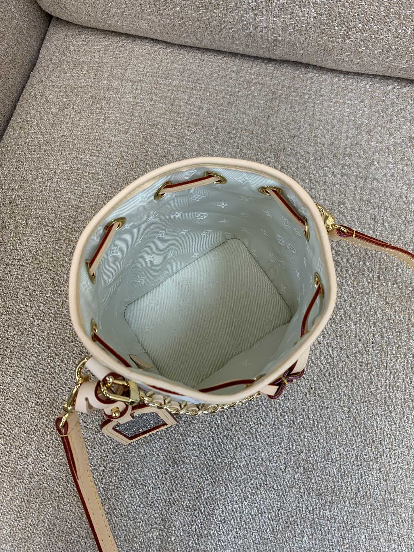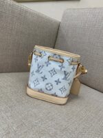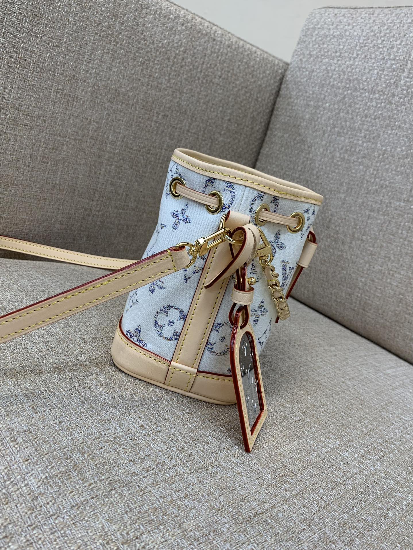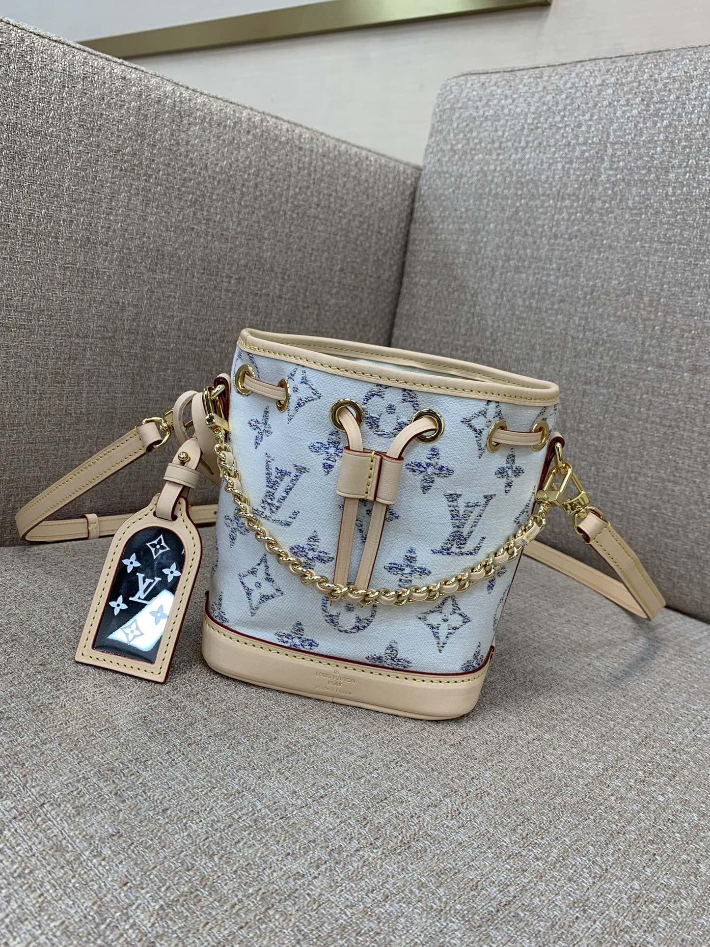 This exclusive edition of the Nano Noé is crafted from Monogram jacquard fabric with a tweed-like appearance. A mini replica of the iconic Noé bag, this model is complemented by natural leather trim on its base, drawstring closure and removable, adjustable shoulder strap. Its handle, which is also removable, is a laced, gold-tone chain.