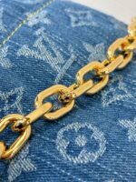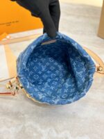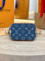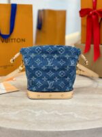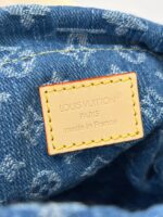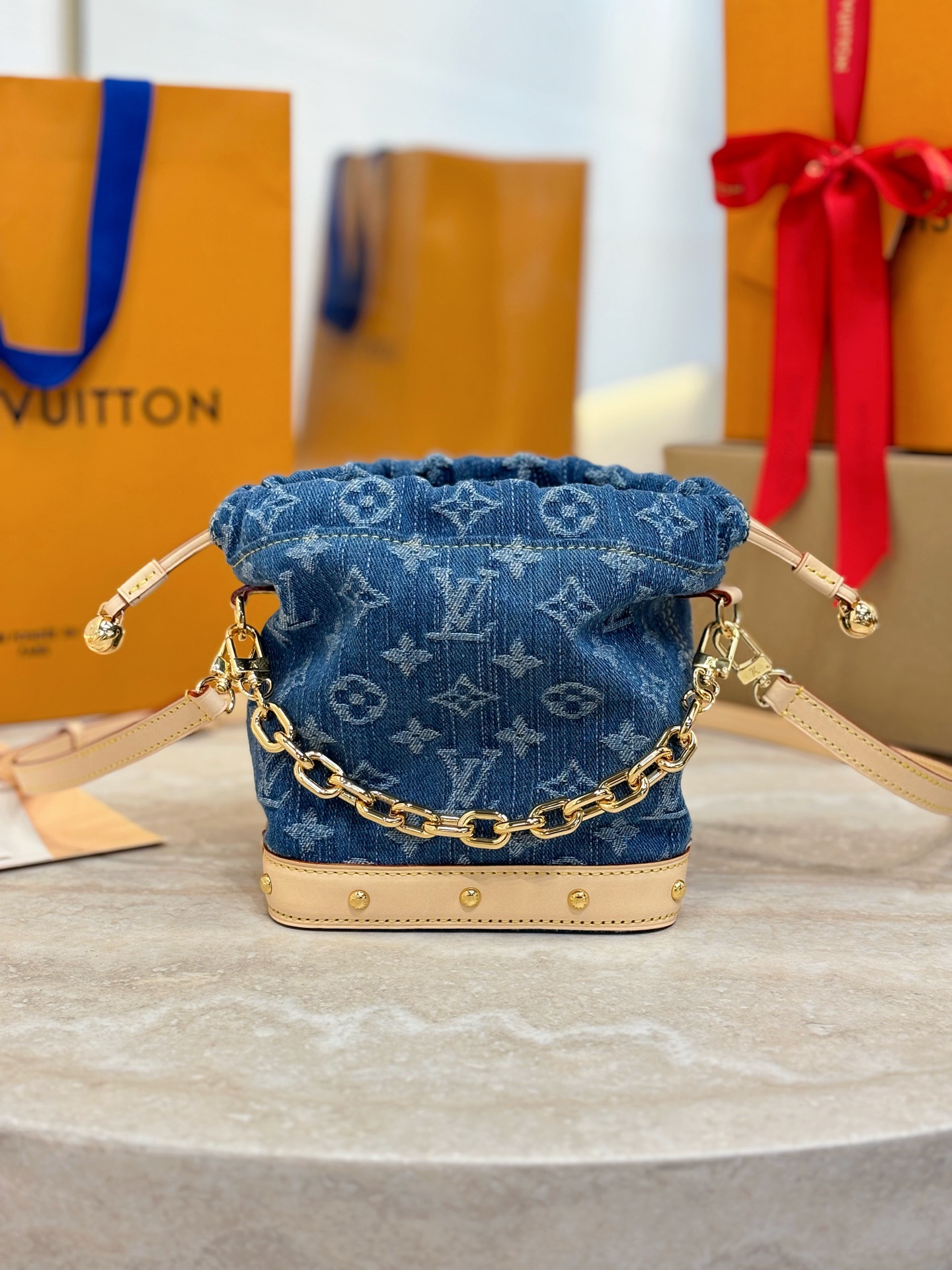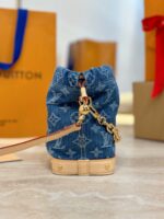 This Nano Noe backpack features a trendy denim color rendered in cotton fabric, with the classic Monogram pattern added to it. The leather trim and eye-catching chain complement each other. The L* logo decoration at the drawstring opening adds a playful touch and pays homage to the brand’s long-standing heritage. Size: 20.5 x 17.5 x 8.8 cm