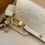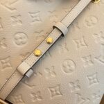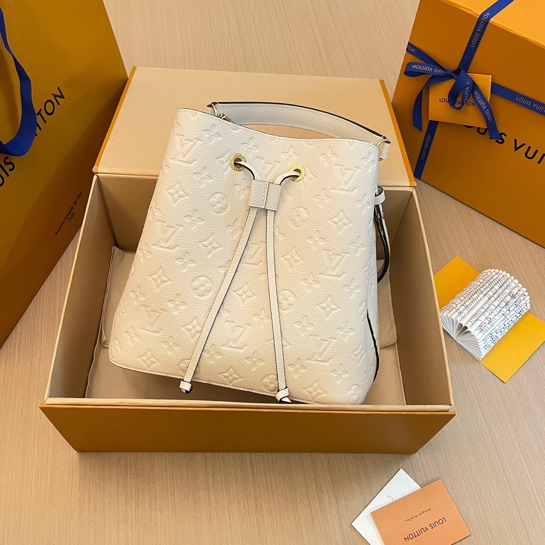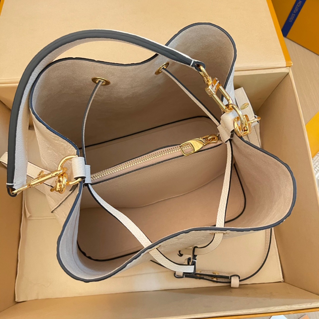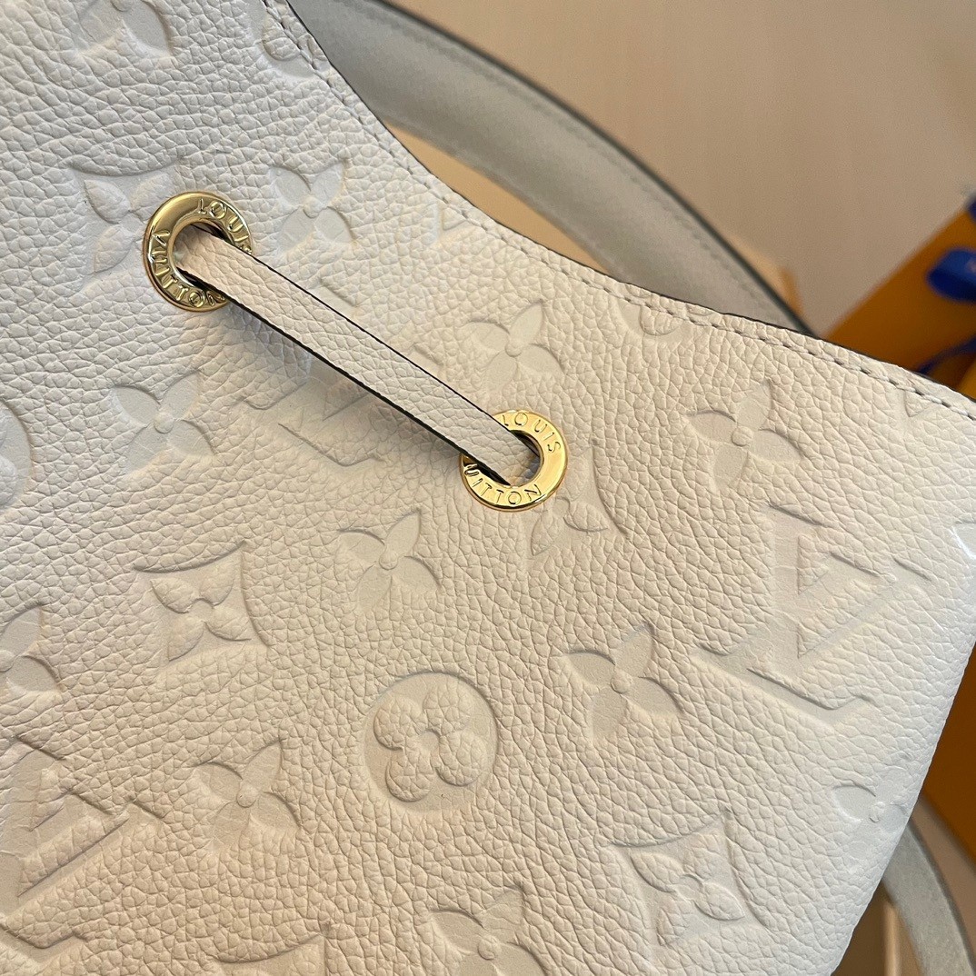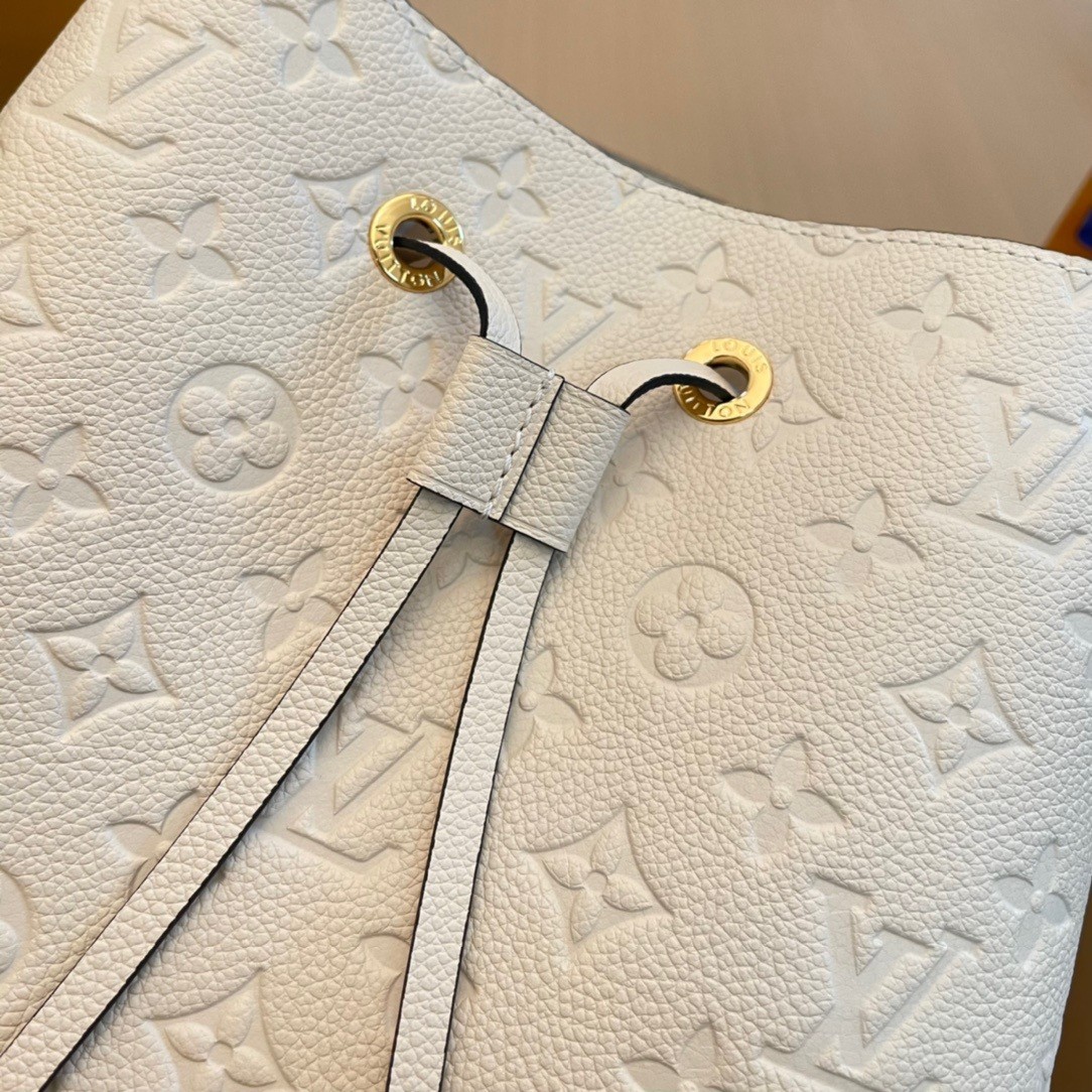 The House’s emblematic bucket bag, the NéoNoé MM, is fashioned from luminous cream-color Monogram Empreinte leather, making it stylish no matter the season. The cream-color microfiber lining and Monogram Flowers and LVs discretely embossed into the leather bring understated charm. A top handle and leather shoulder strap offer a variety of carry options.