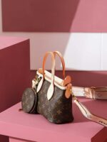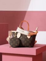This season the House’s forever favorite, the Neverfull, gets reinvented as a mini-tote: the Neverfull BB handbag. This scaled-down version features an adjustable and detachable textile strap as well as a playful coin purse attached to a D-ring. It is just the right size for small essentials like a smartphone and compact wallet.