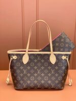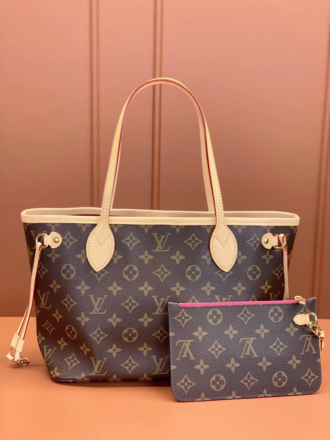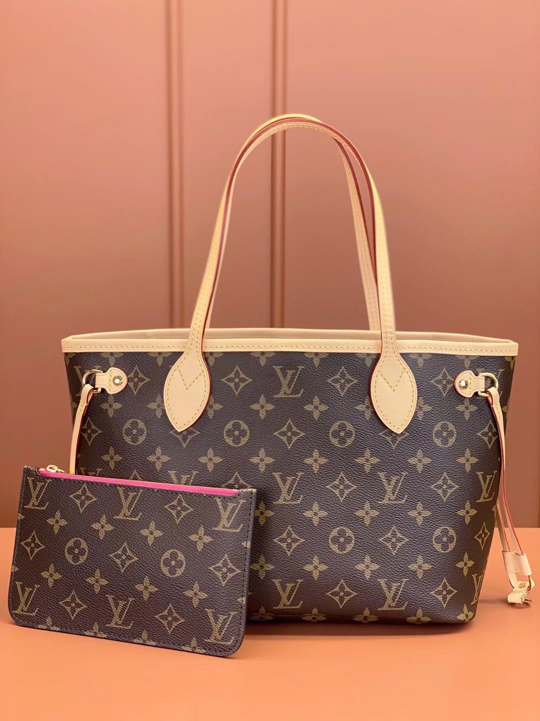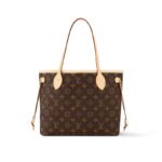 The Neverfull PM tote pairs timeless design with heritage details. Crafted from Monogram coated canvas with natural cowhide trim, it is capacious yet not bulky, with side laces that cinch for a sleek allure or loosen for a casual look. Slim, comfortable handles slip easily over the shoulder or arm. Lined in colorful textile, it features a removable pouch which can be used as a clutch or an extra pocket.