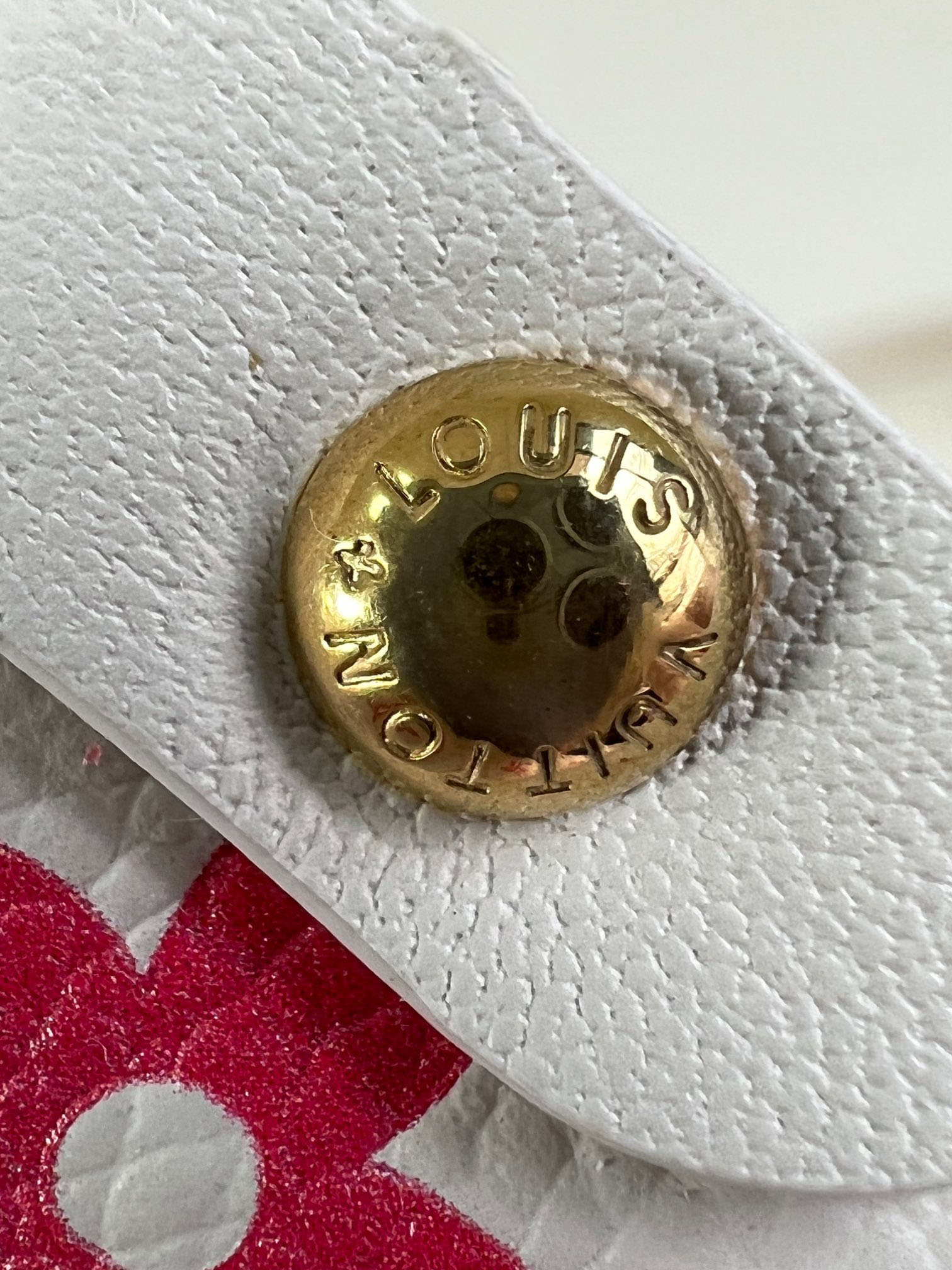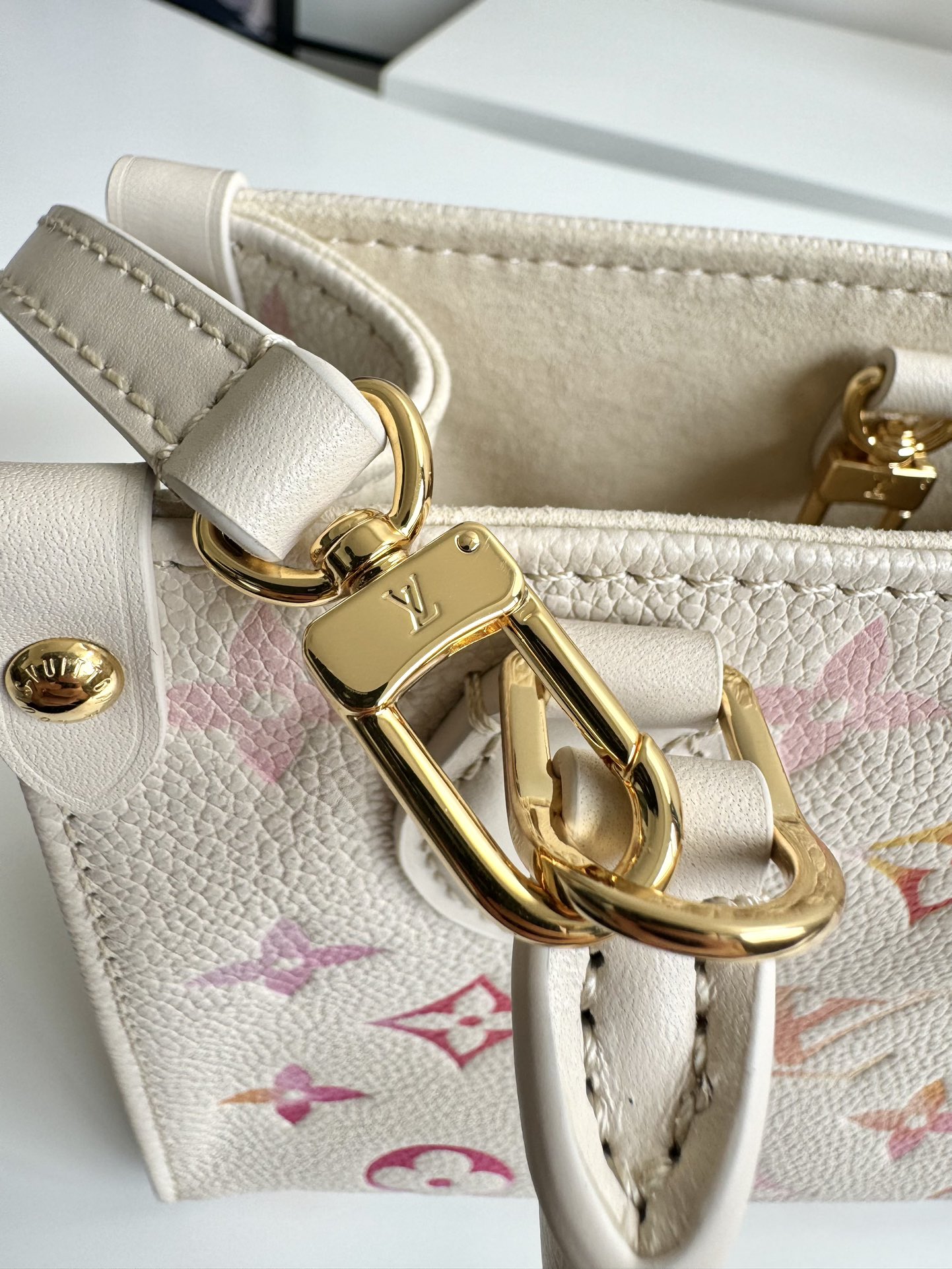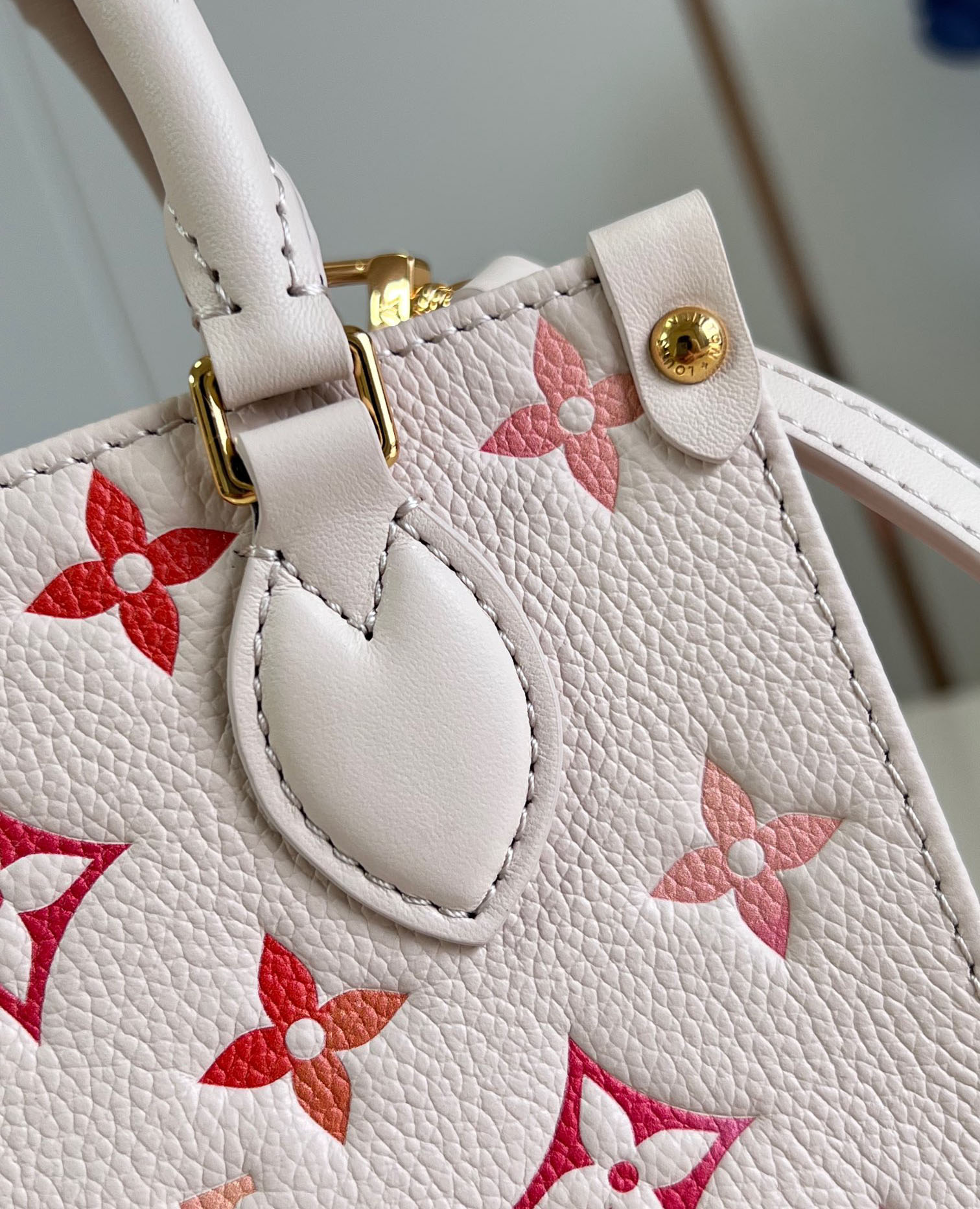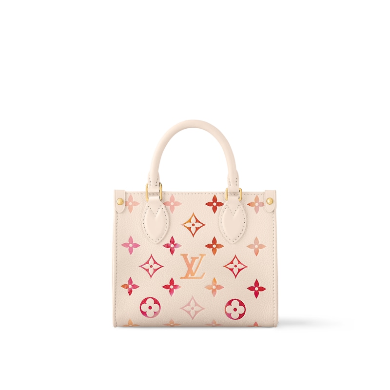 Part of the Sunrise Aquarelle collection, this OnTheGo BB handbag is fashioned from Monogram Empreinte leather in a colorway of orange, pink and fuchsia, inspired by sunrise. The LVs and Monogram Blossoms printed on the leather have a watercolor aspect. A hint of glossiness is screen-printed onto the surface, like glistening drops of morning dew. Two rolled-leather top handles and a removable and adjustable strap enable various carry options.