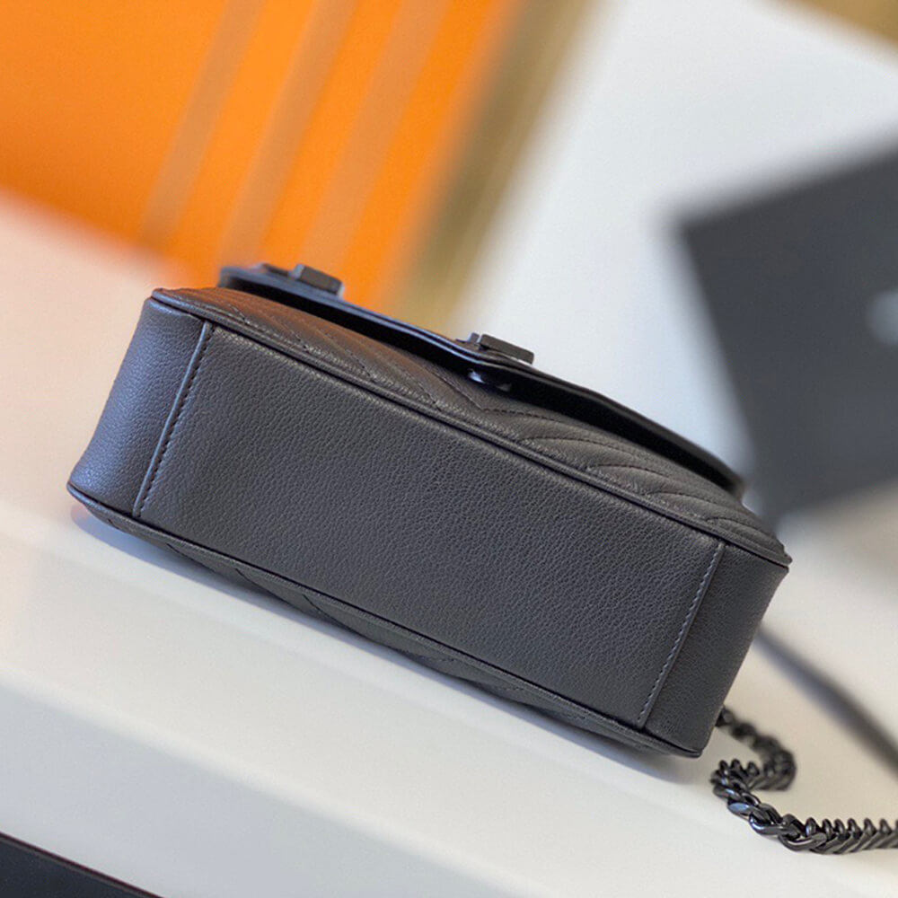 Antiqued-gold chain and black leather shoulder strap. black leather handle