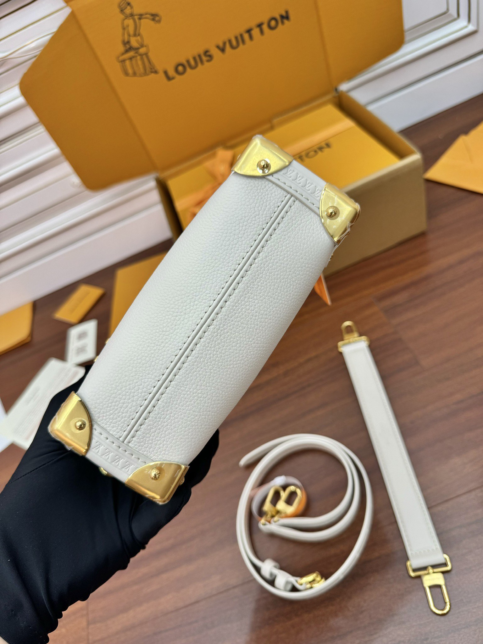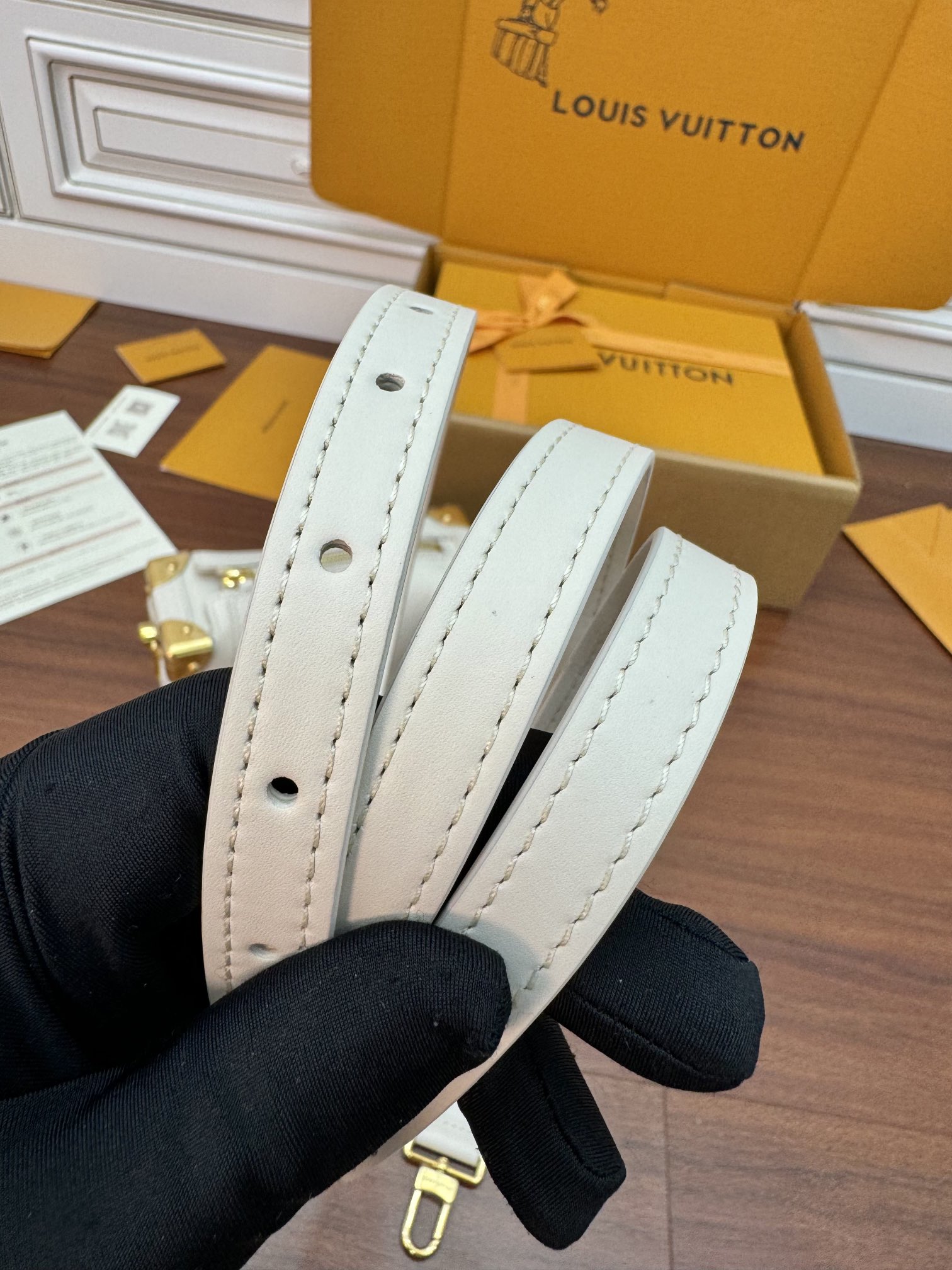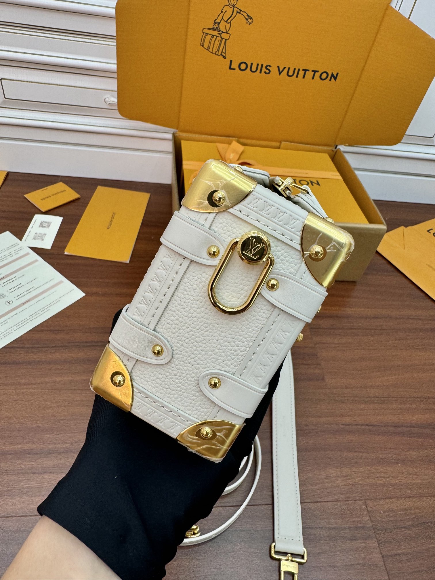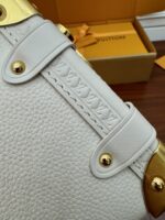 Crafted from grained calfskin leather with a gold-color S-lock and corners, the Side Trunk PM takes its inspiration from the House’s vintage trunks. A detachable leather handle and a removable and adjustable leather strap give carry options. The Side Trunk fits a wallet, large smartphone, keys, and lipstick.