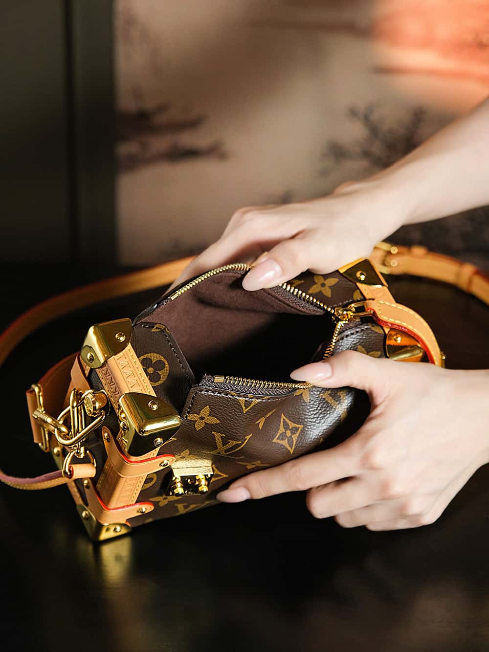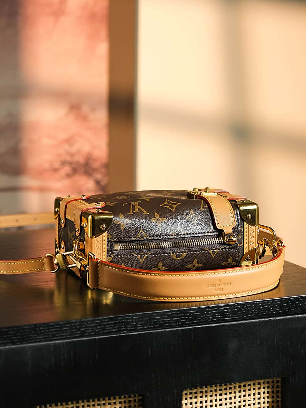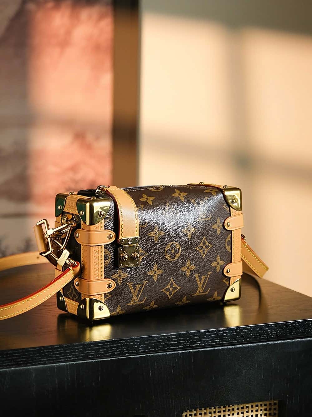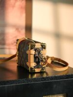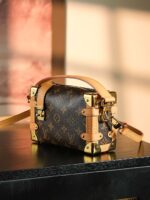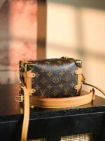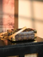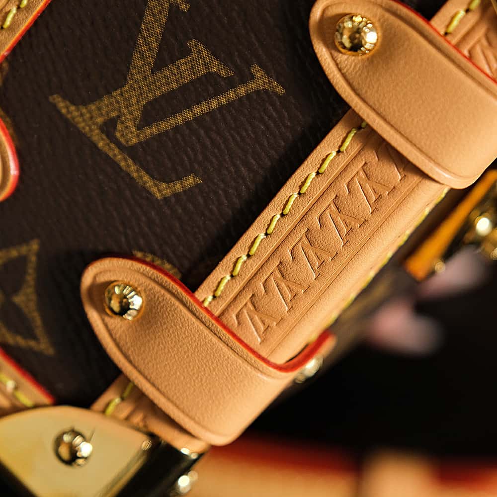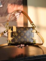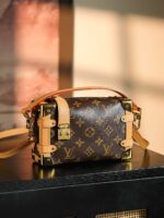 Evocative of the House’s historic trunks, the Side Trunk PM’s rectangular shape is fashioned from Monogram canvas with cowhide-leather trim and gold-color hardware. The reinforced corners and S-lock attached to the zipper are directly inspired by Louis Vuitton trunks. It can be carried by hand or on the shoulder thanks to the removable and adjustable leather strap.